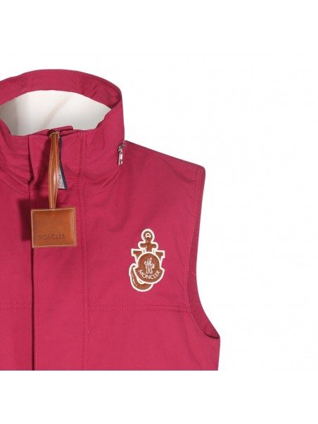 Red cotton blend vest puffer down jacket from Moncler Genius J.W. Anderson featuring zip closure, logo patch, zip closure fastening and removable leather patch.