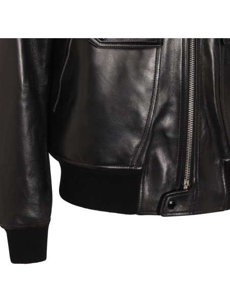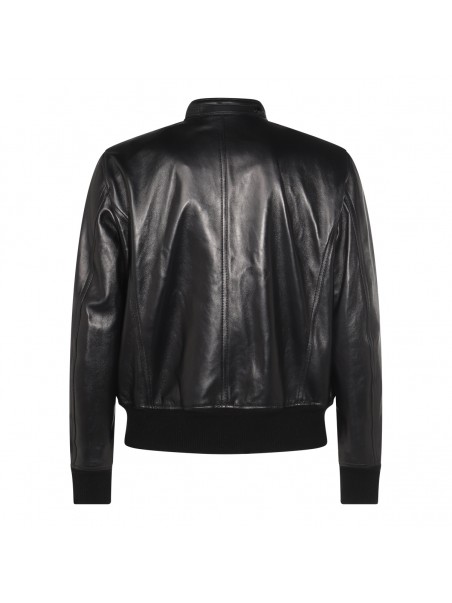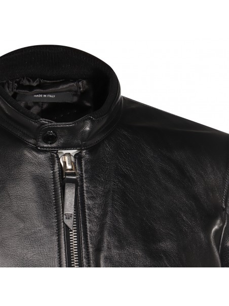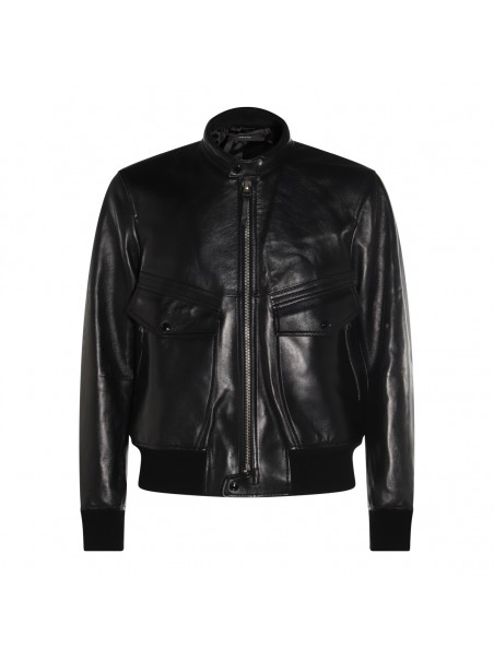 Black leather jacket from Tom Ford featuring long sleeves, ribbed cuffs and hem, pockets and regular vestibility.