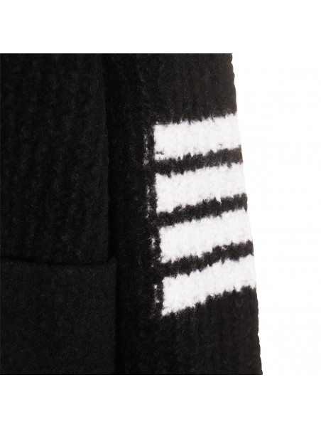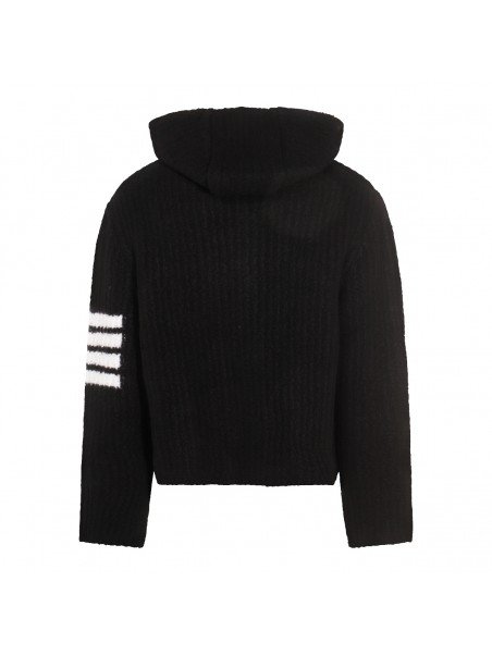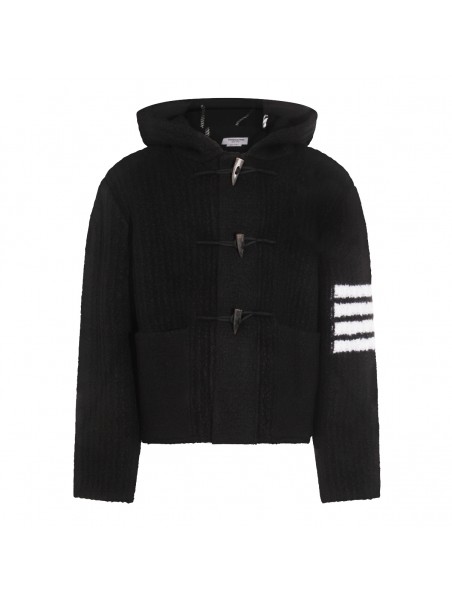 Black casual jacket from Thom Browne featuring high collar, long sleeves, frontal fastening and pockets.