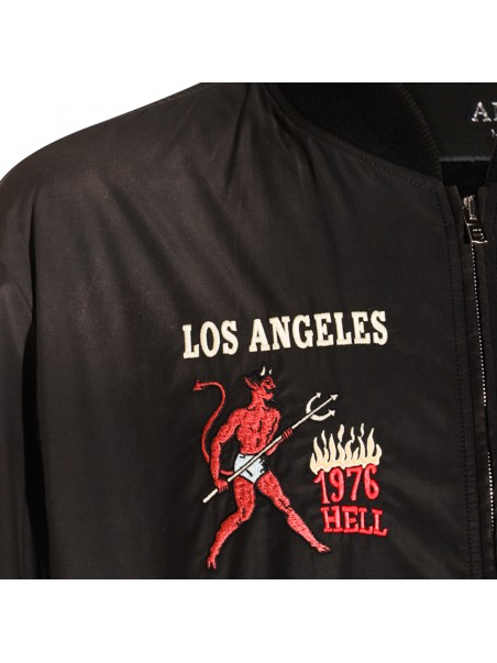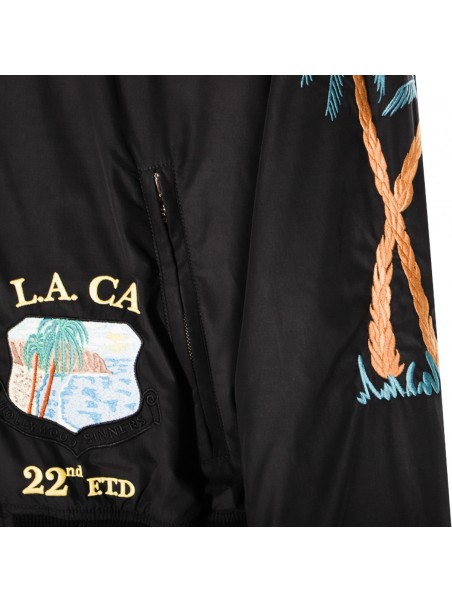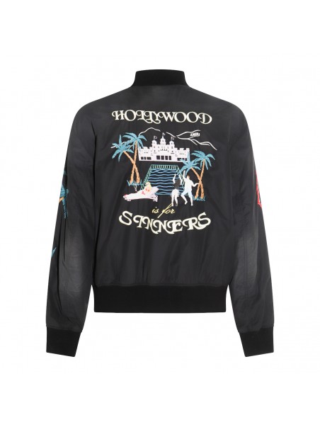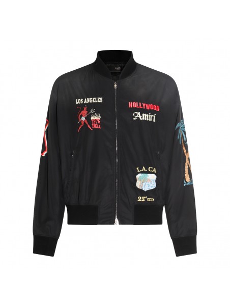 Black casual jacket from Amiri featuring long sleeves, zip fastening, ribbed cuffs and hem and logo patches.