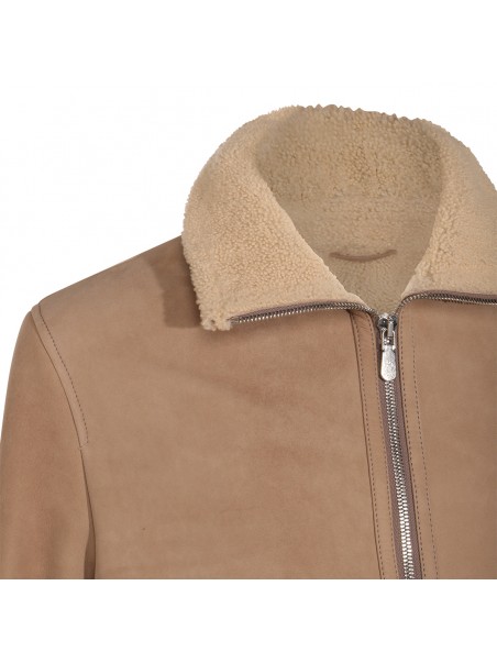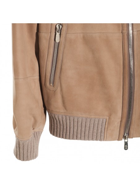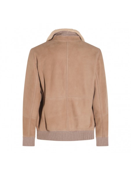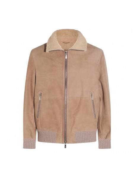 Beige leather jacket from Brunello Cucinelli featuring long sleeves, zip fastening, ribbed cuffs and hem and zip pockets.