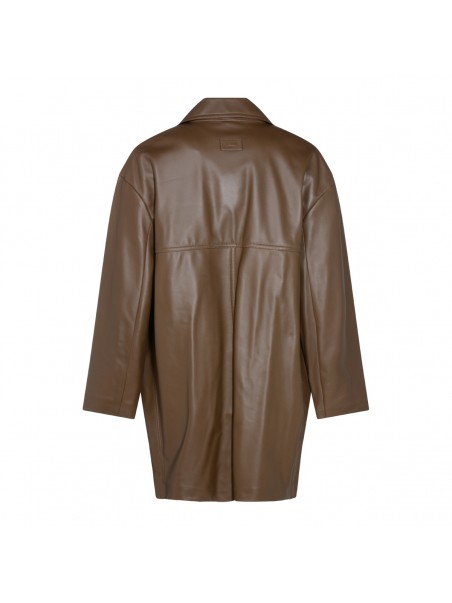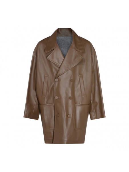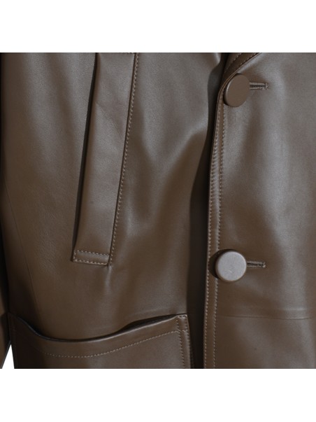 Brown leather jacket from Fendi featuring lapel collar, long sleeves, double breasted, back logo patch, zip closure and welt pockets.