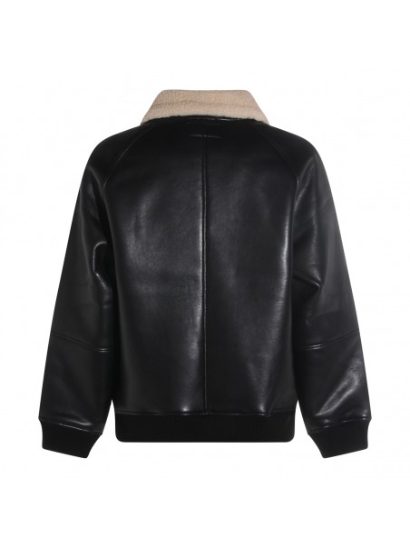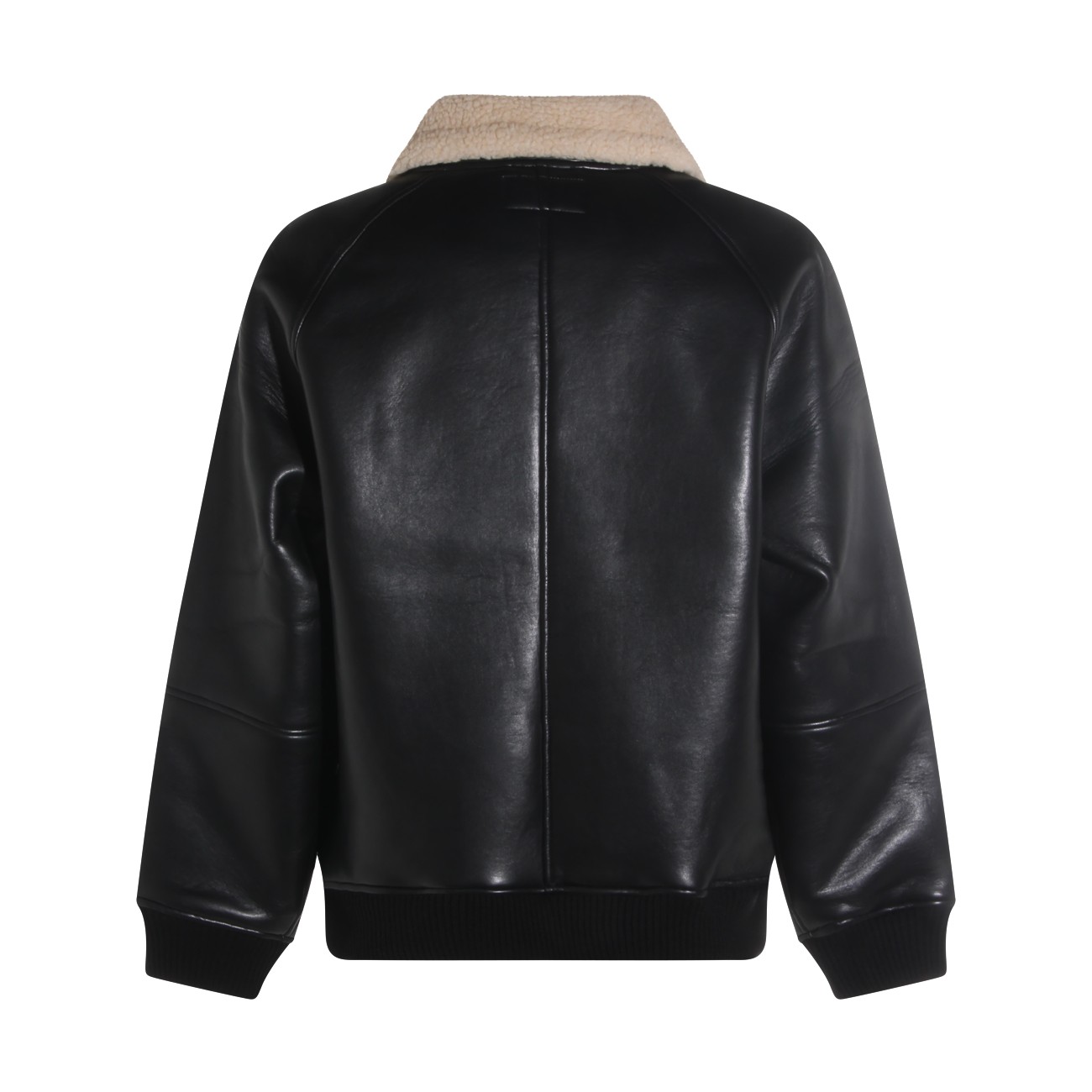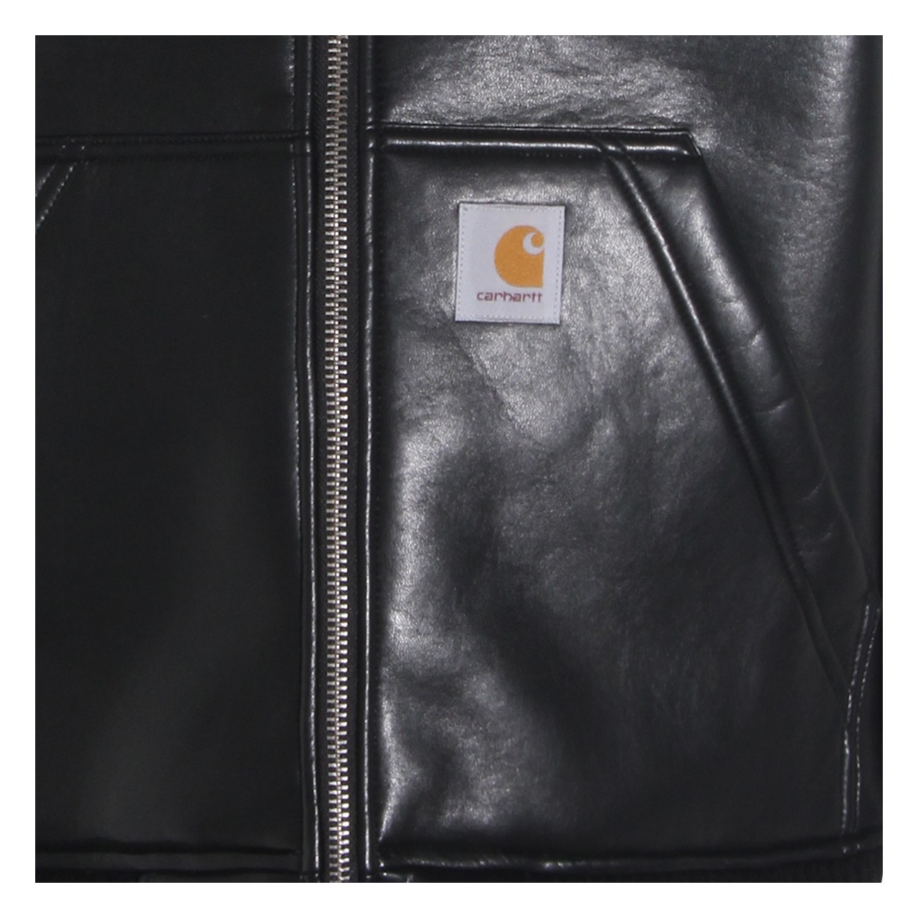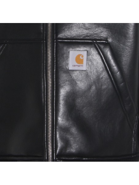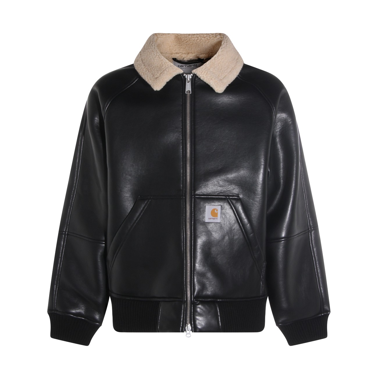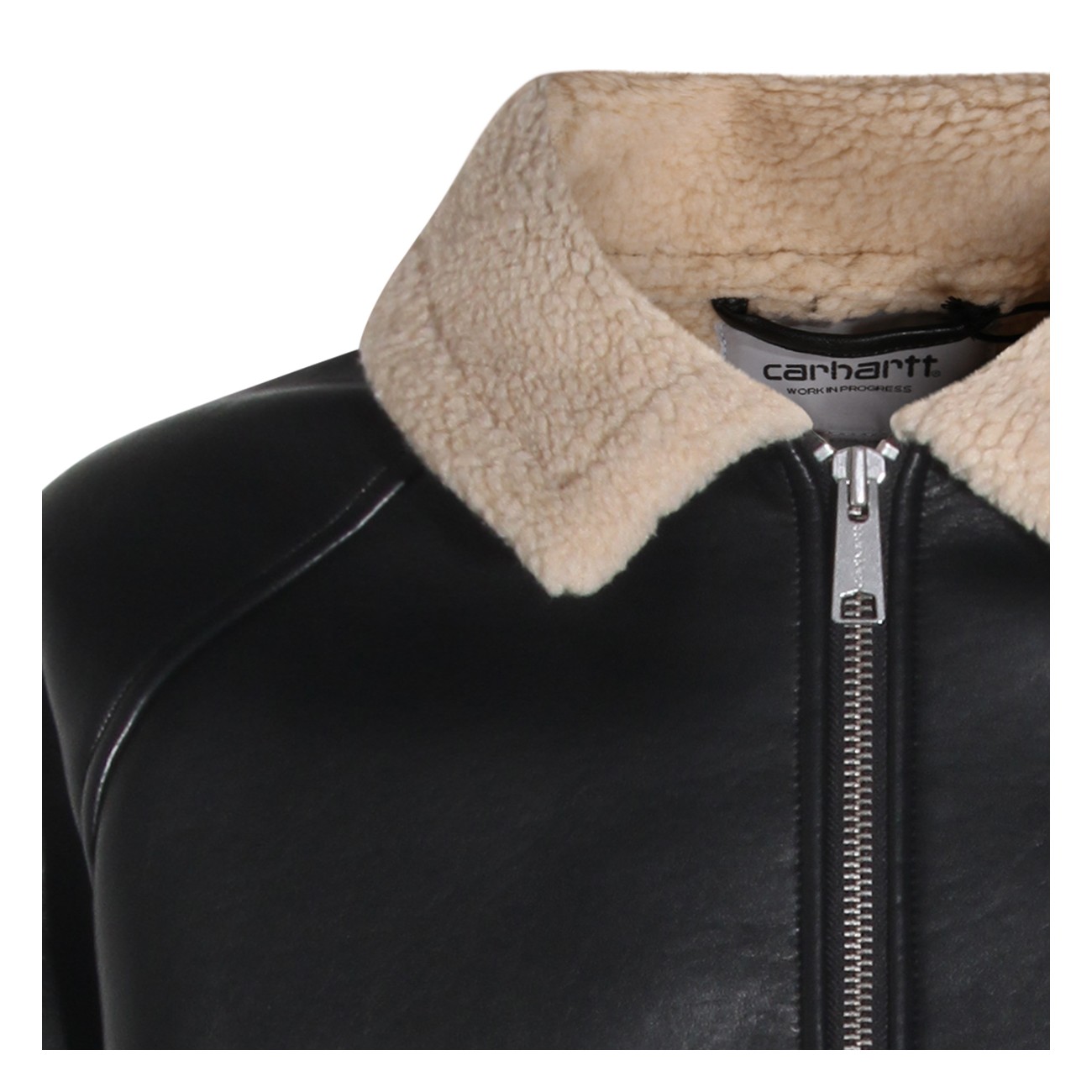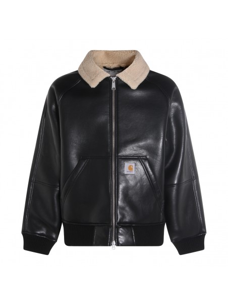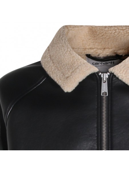 Black leather jacket from Carhartt Wip featuring faux fur collar, zip fastening, long sleeves, pockets, frontal logo and soft vestibility.