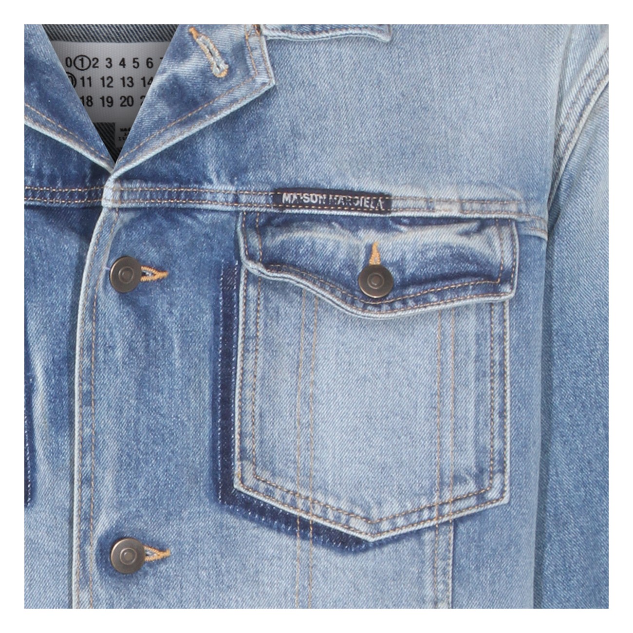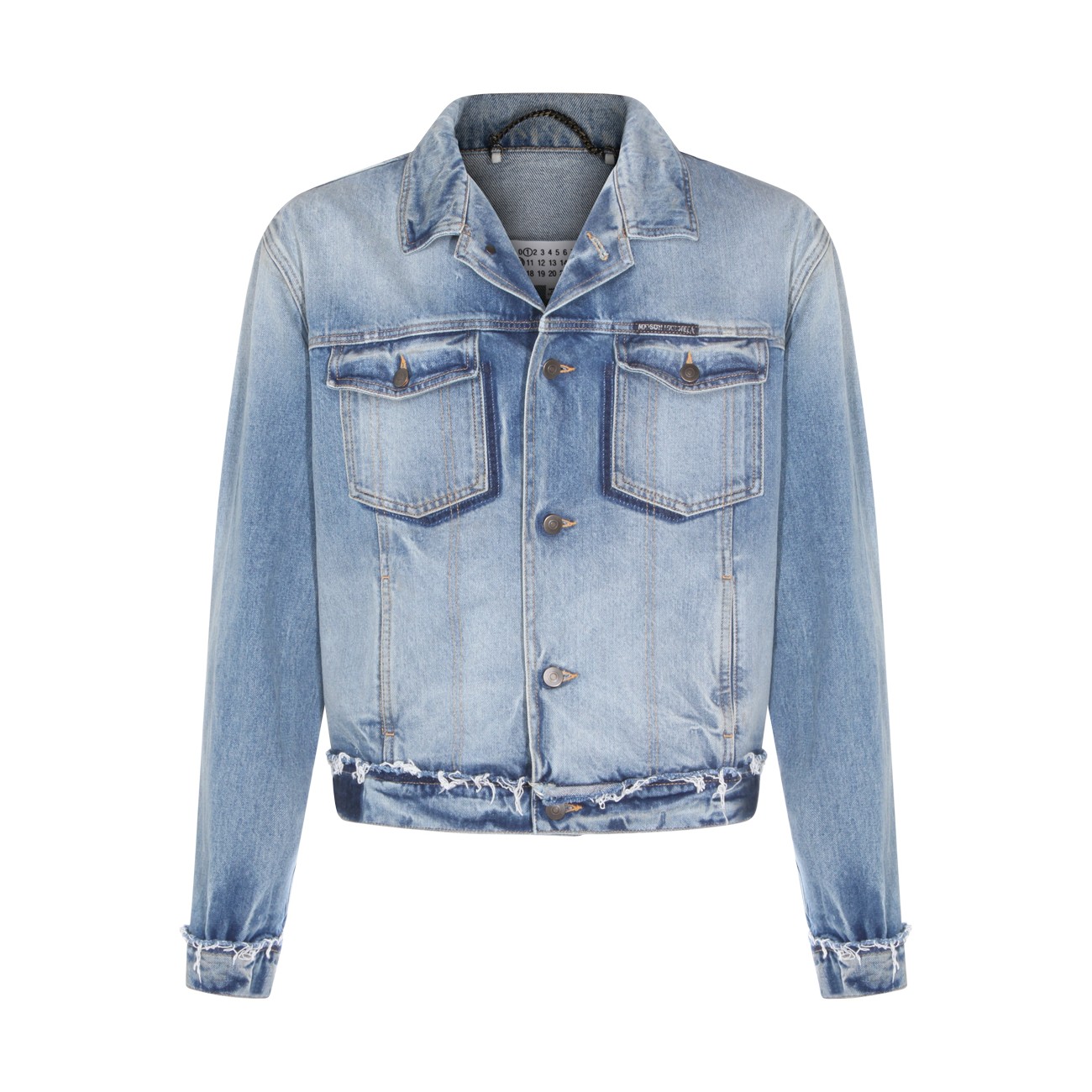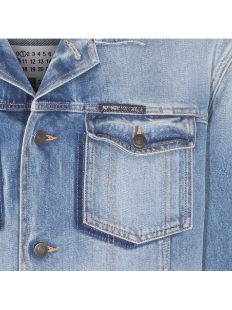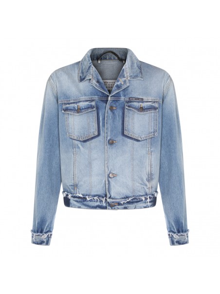 Light blue cotton denim jacket from Maison Margiela featuring classic collar, frontal button fastening, long sleeves, frontal logo and chest pockets.