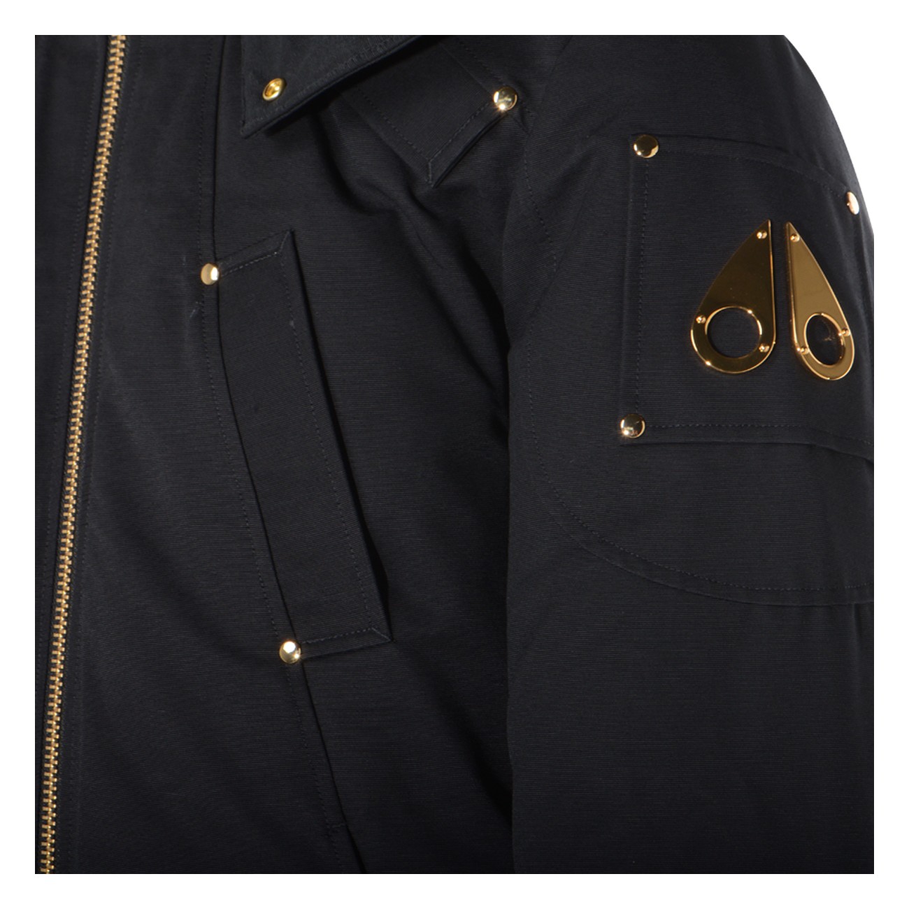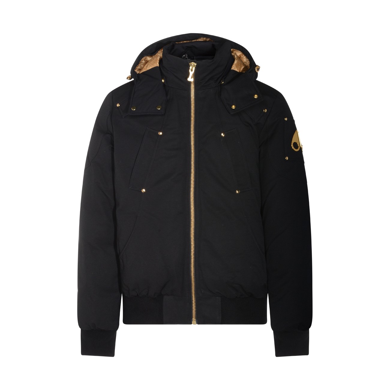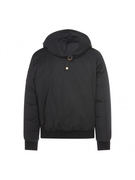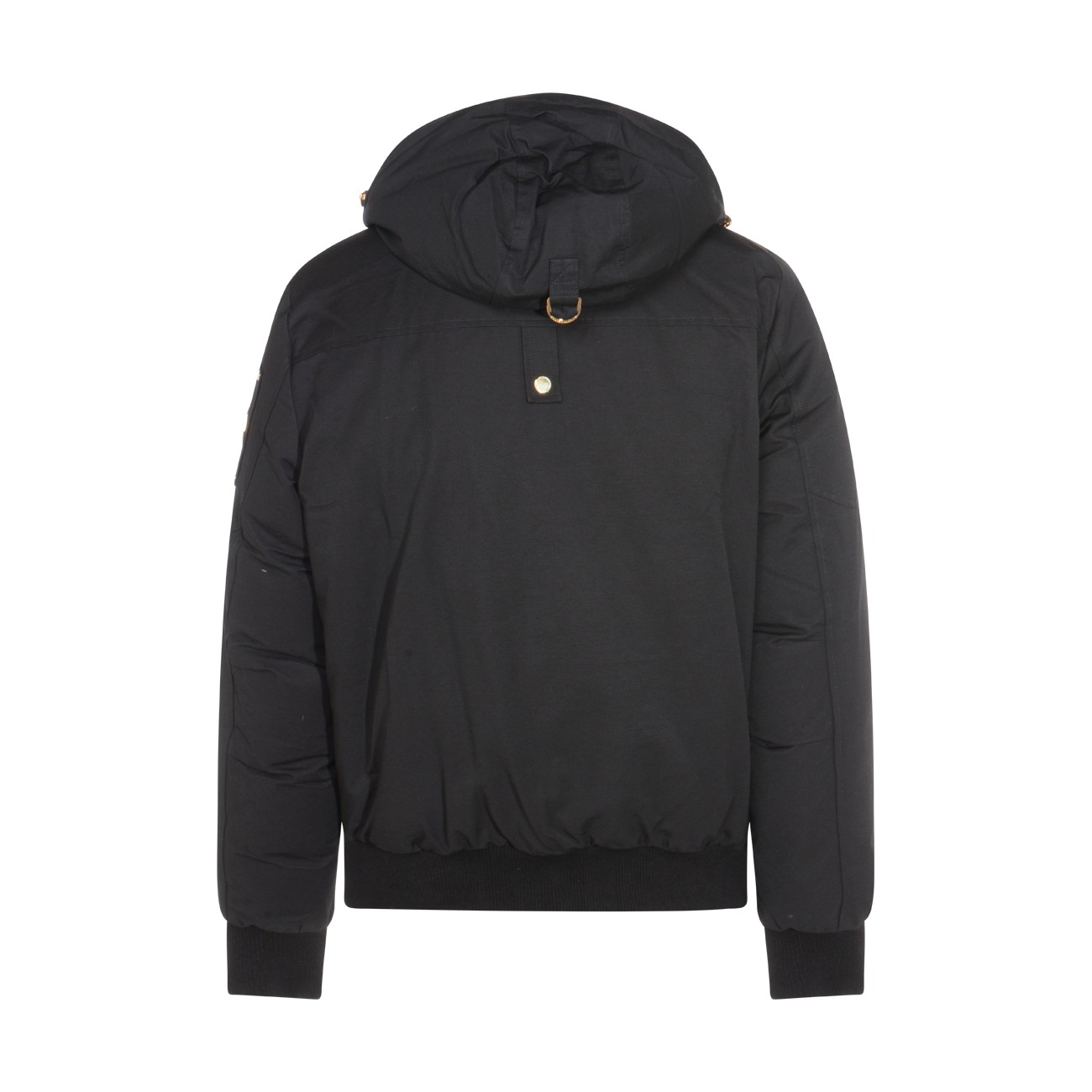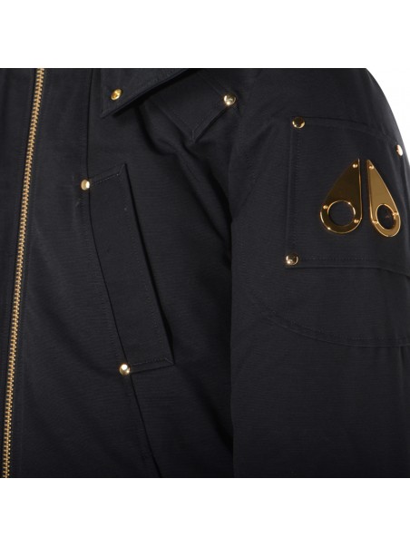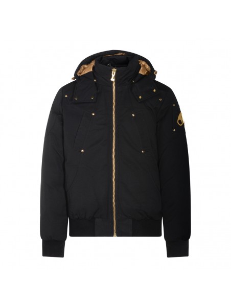Black cotton casual jacket from Moose Knuckles featuring high collar, hood, long sleeves, zip fastening, details, elasticated cuffs and hem and regular vestibility.