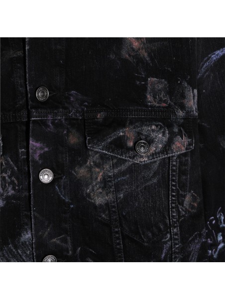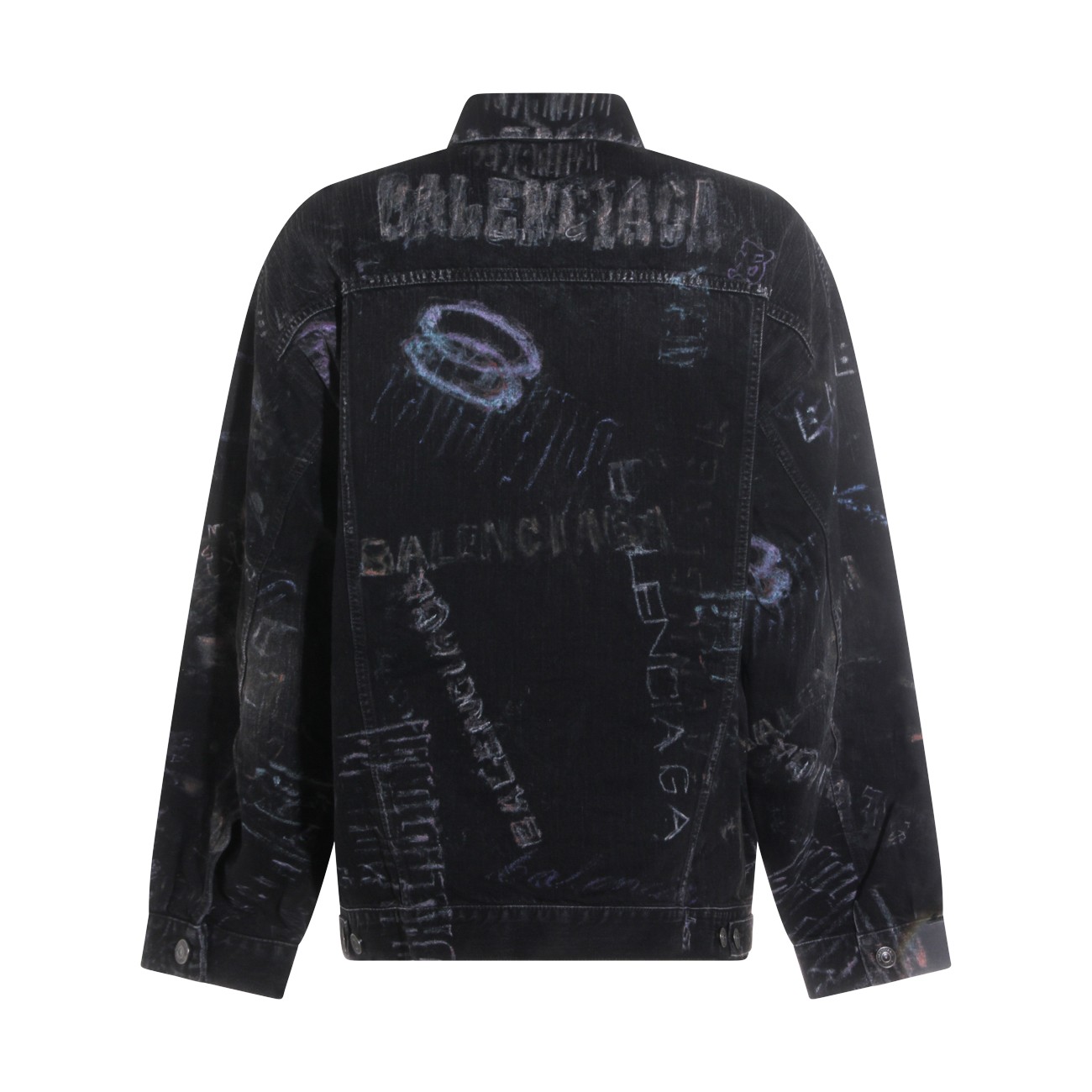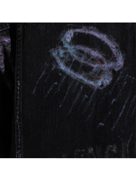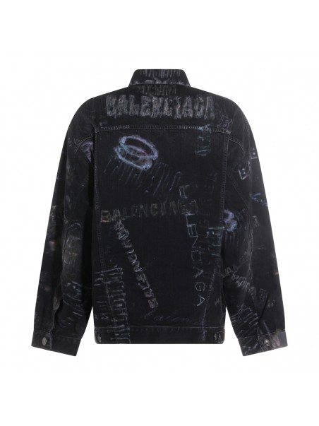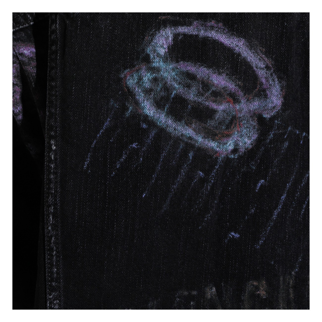 Black cotton denim jacket from Balenciaga featuring long sleeves, buttons fastening, shirt collar, all over details, frontal pockets and regular vestibility.