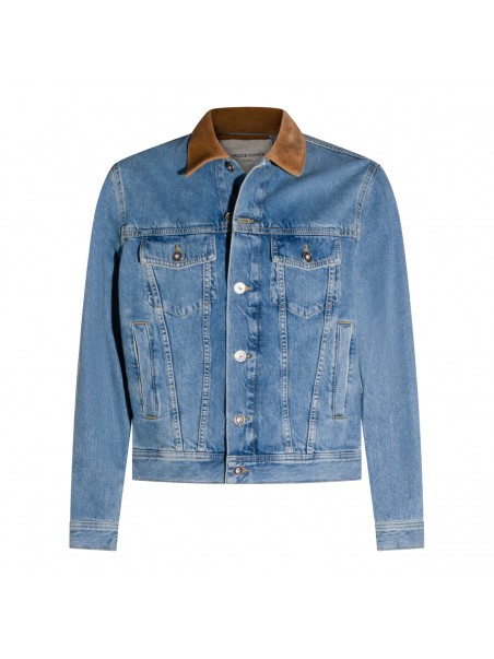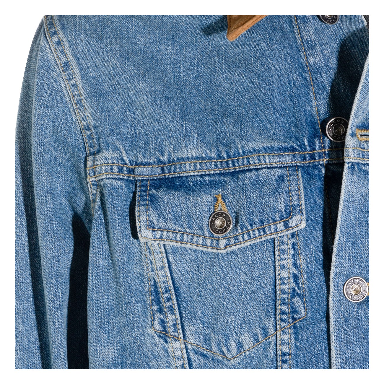 Light blue cotton denim jacket from Jacob Cohen featuring long sleeves, brown shirt collar, buttons fastening, frontal pockets and regular vestibility.