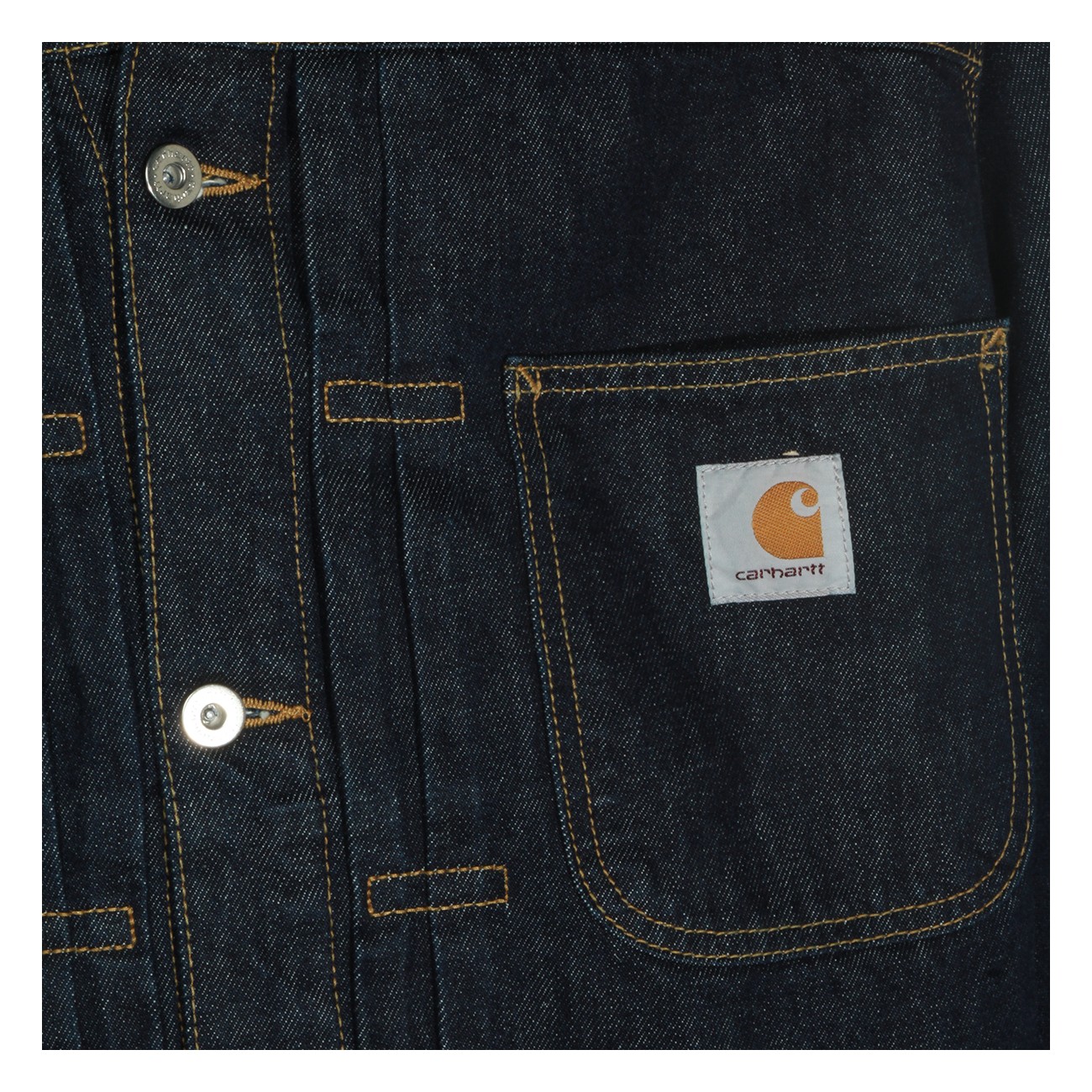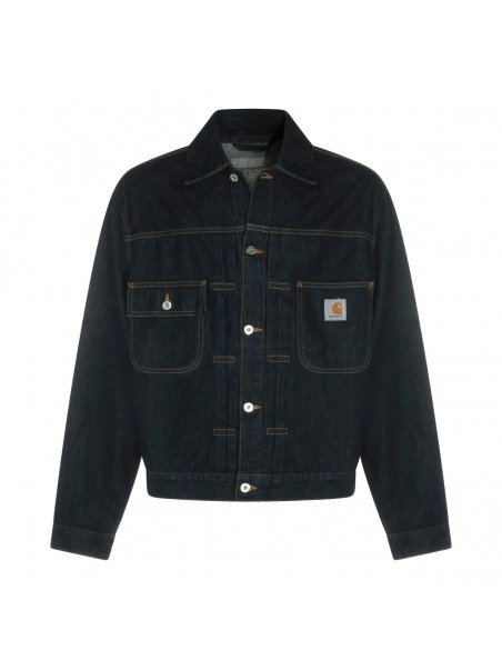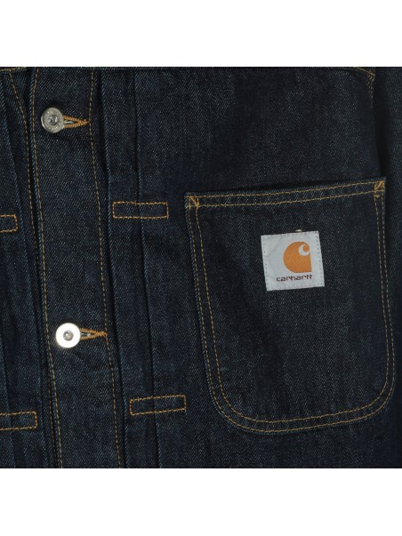 Dark blue cotton Belmar denim jacket from Carhartt WIP featuring long sleeves, metal buttons closure, chest pockets, logo patch and regular fit.