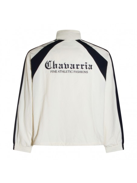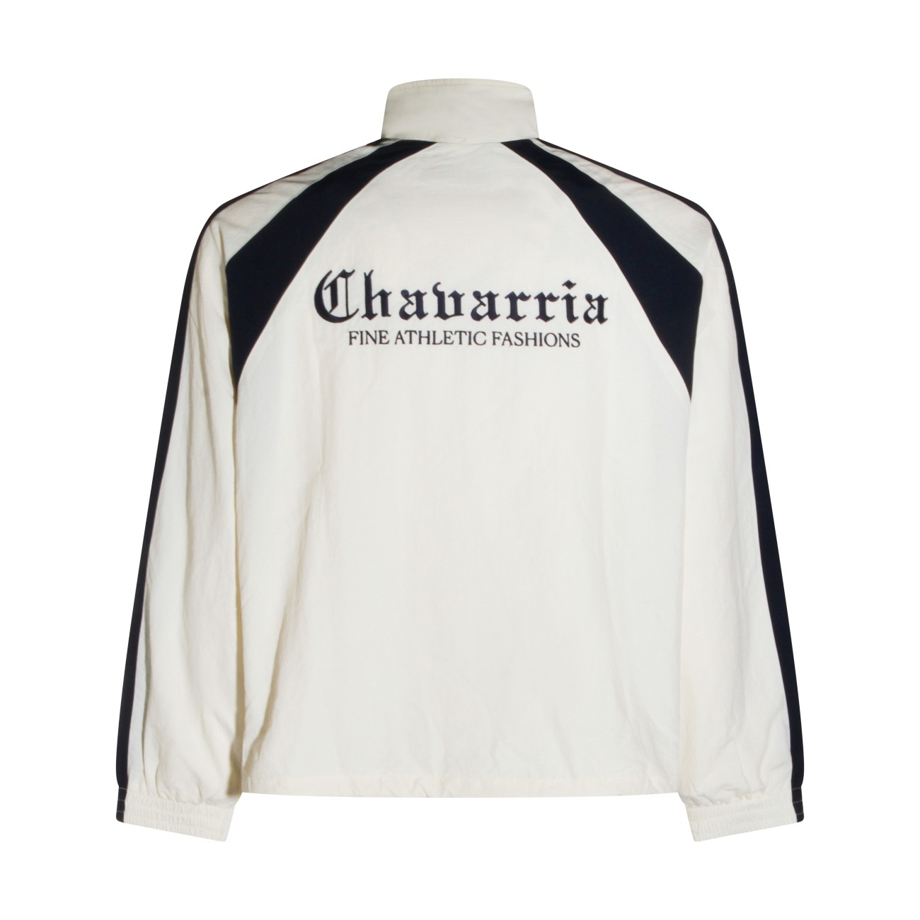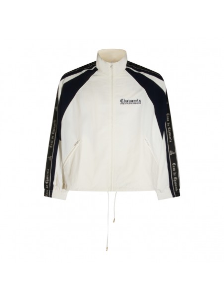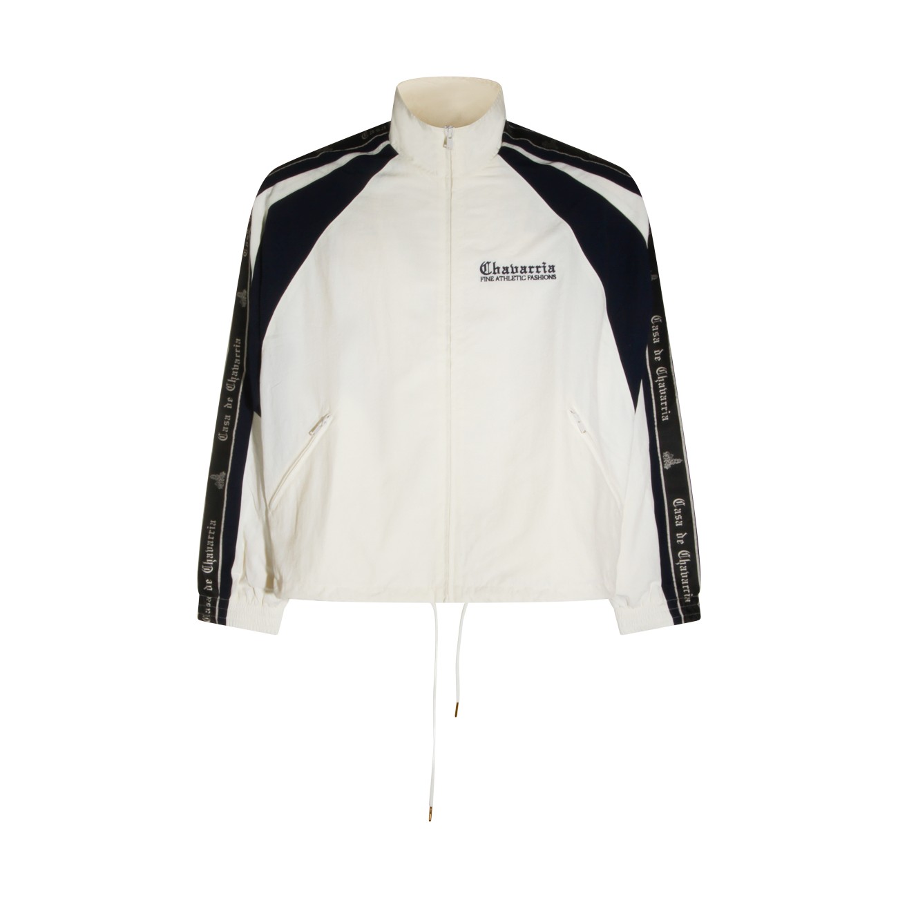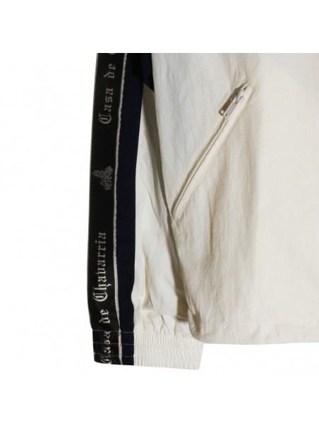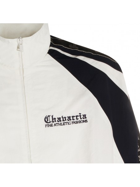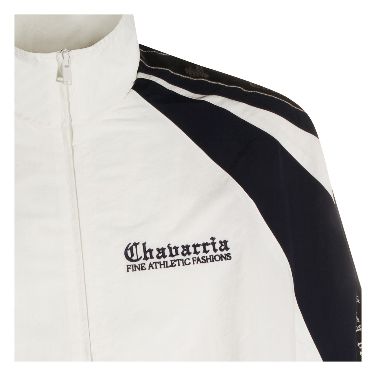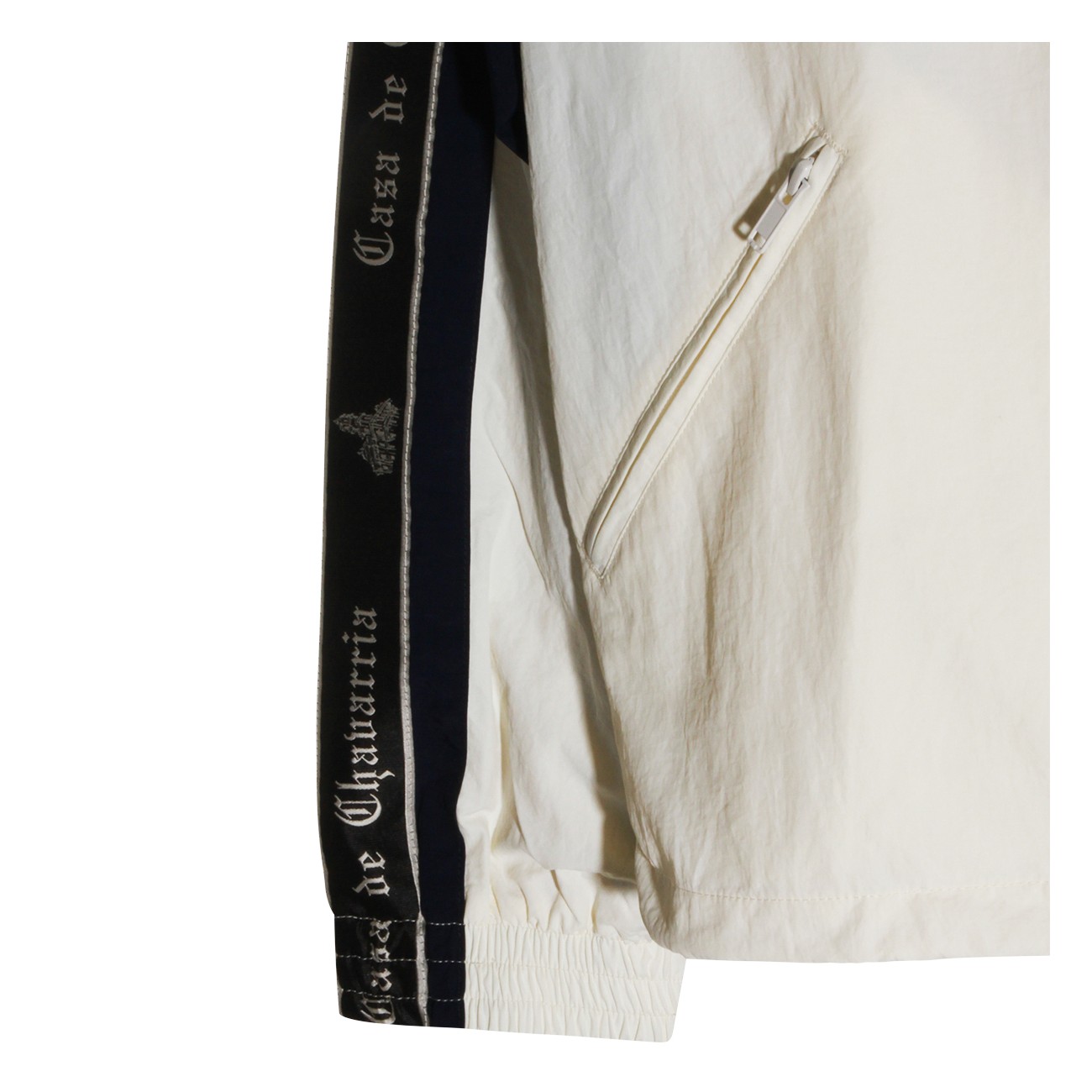 White and black nylon casual jacket from Willy Chavarria featuring long sleeves, high collar, frontal logo print and regular vestibility.
