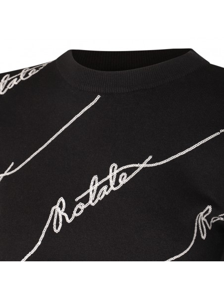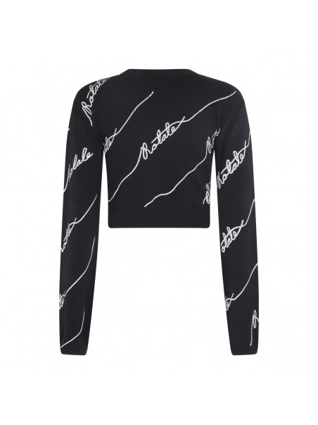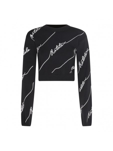 Black cotton and wool blend Logo sweater from Rotate featuring cropped line, round neck, straight hem and contrasting all over logo signature detail.
