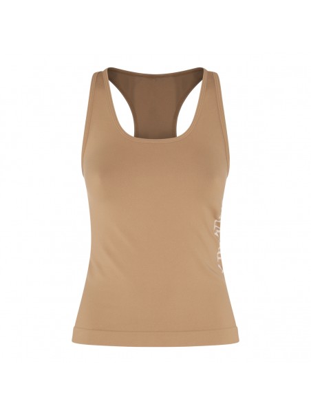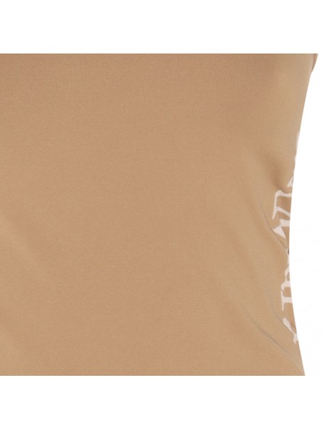Beige Fortuna top from S Max Mara featuring halter neckline, stretch fit and logo detail at side.