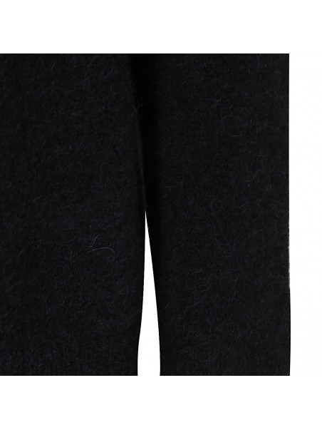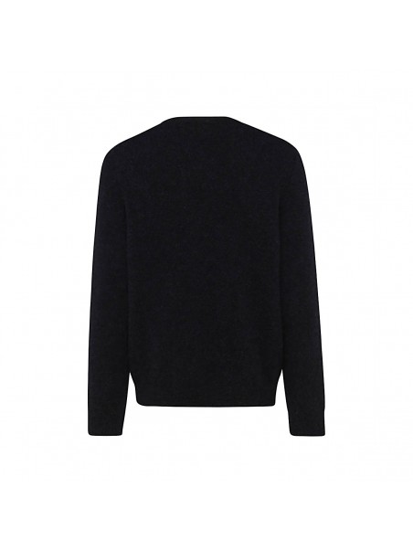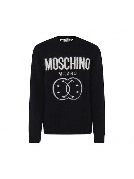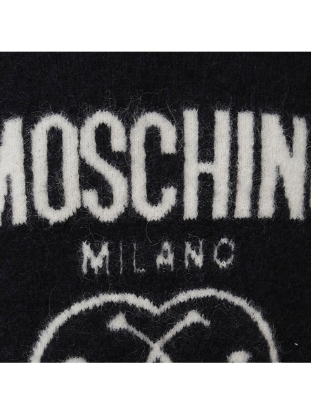 Black wool-blend jumper from Moschino featuring fine knit, brushed effect, white intarsia-knit logo, crew neck, long sleeves and straight hem.