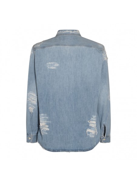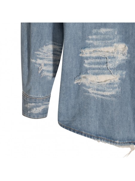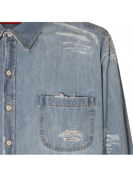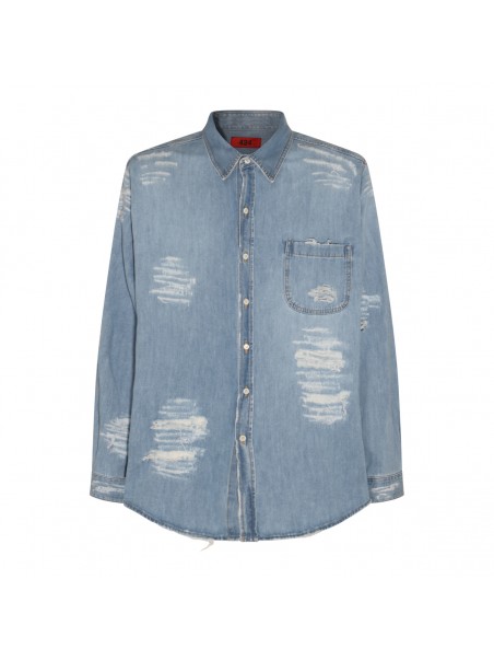 Blue denim jacket from 424 featuring used effect, clap button closure, chest pocket and long sleeves.