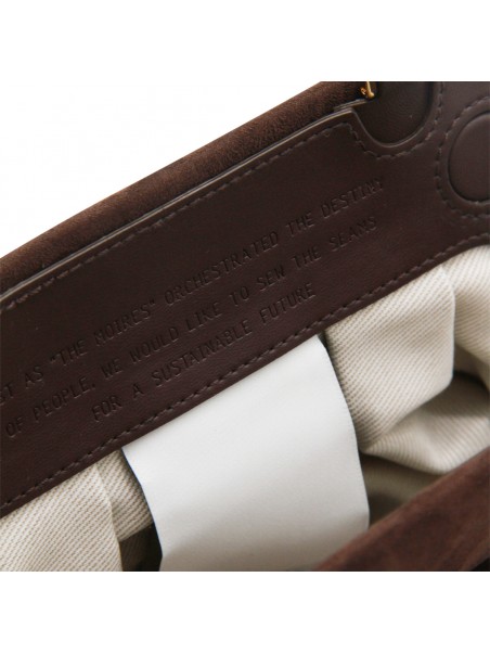Brown suede Tia clutch from Themoire featuring magnetic closure, suede, adjustable and removable shoulder strap, gold tone hardware and main compartment.