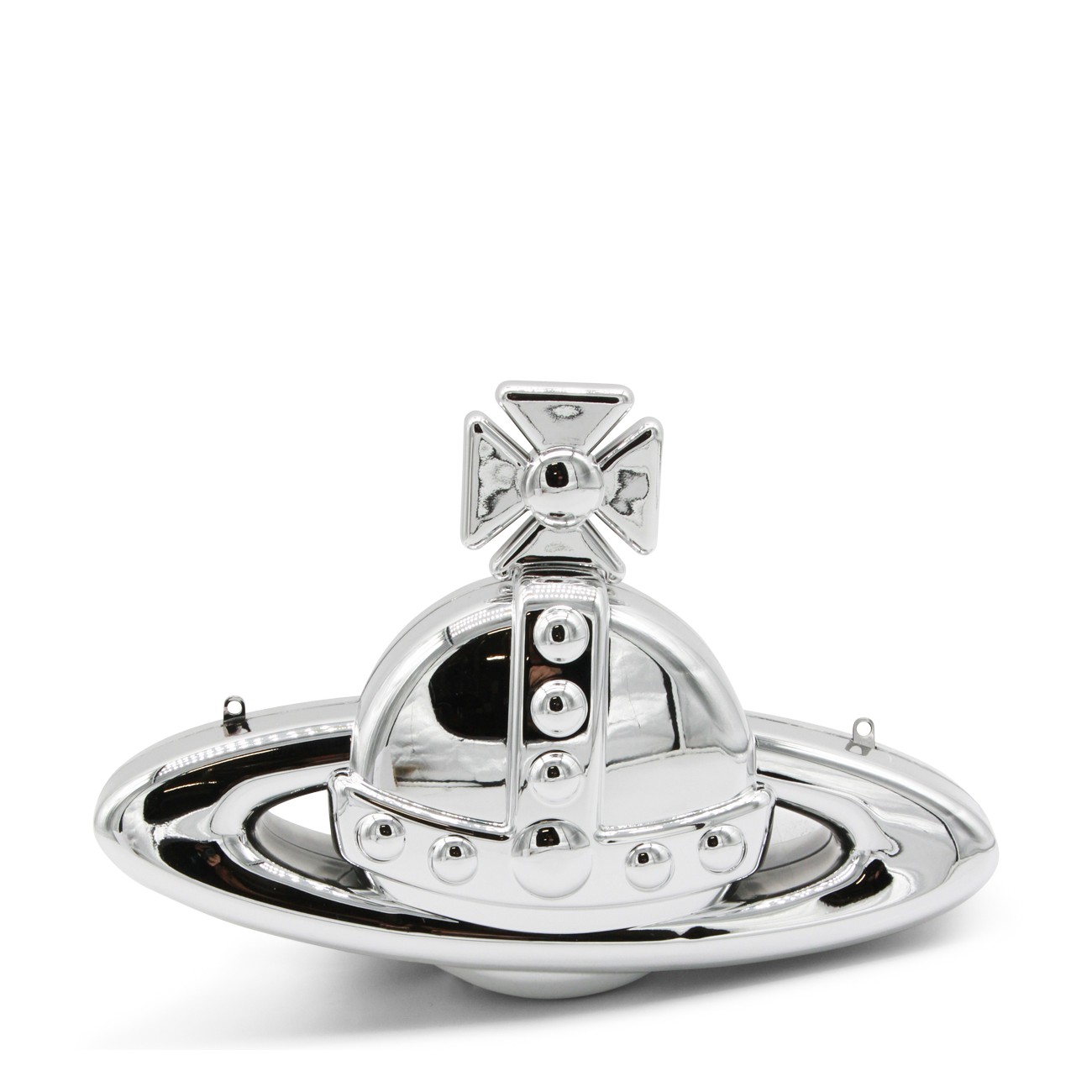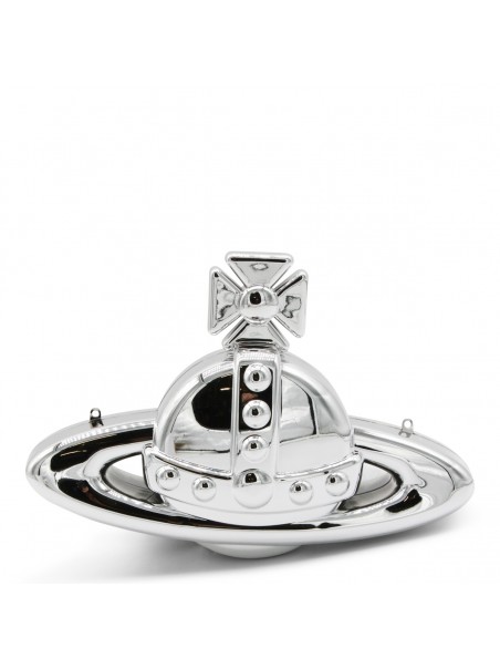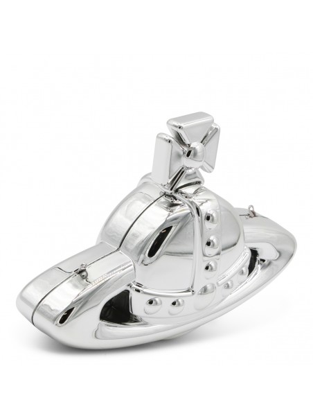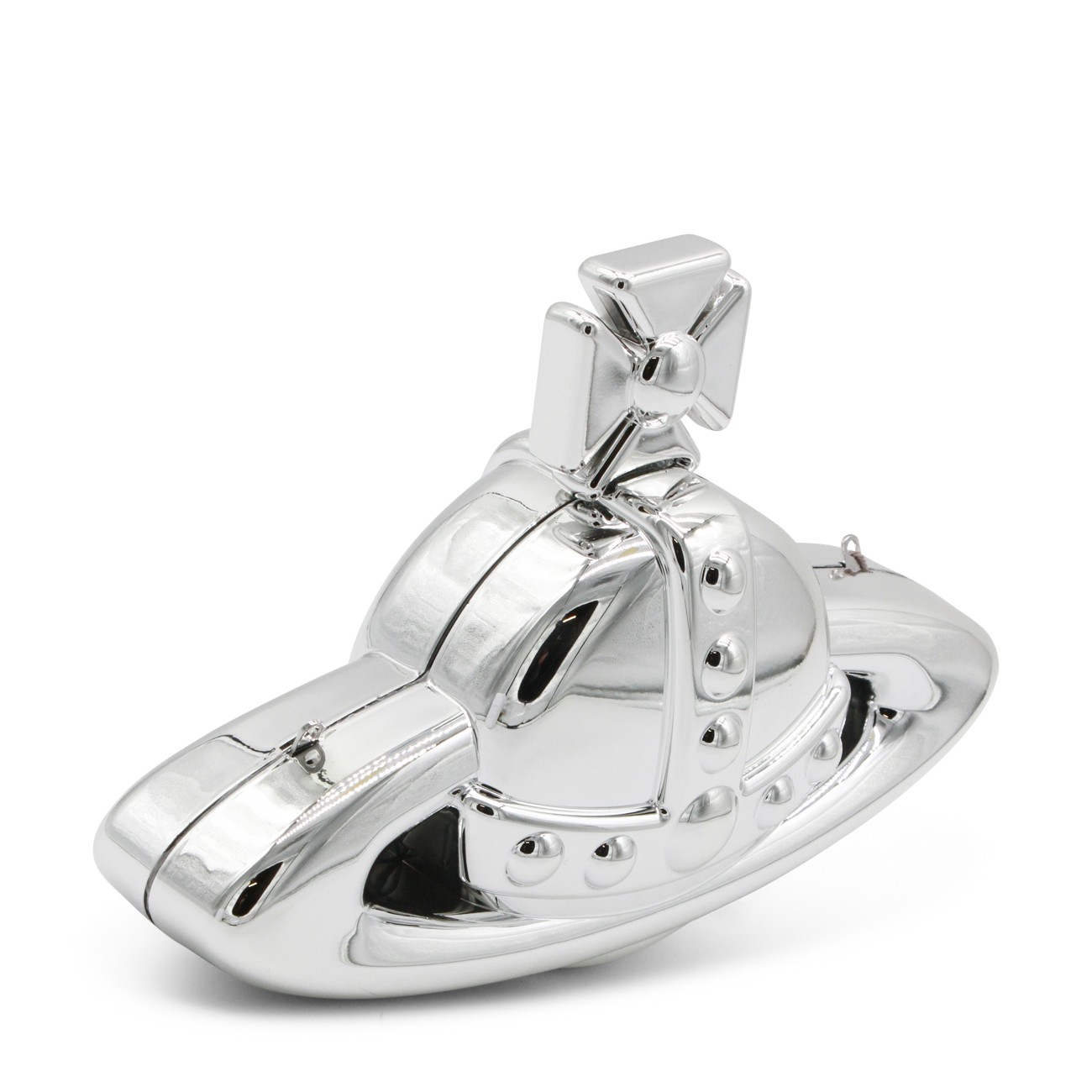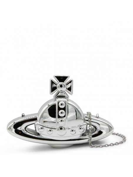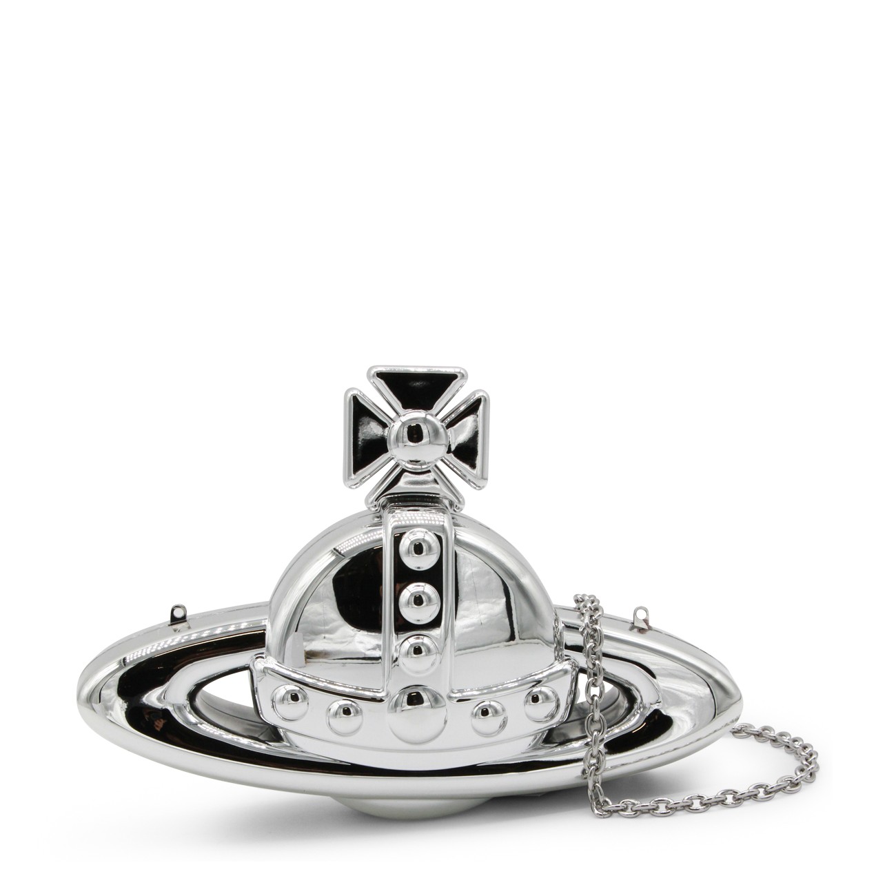 Silver tone clutches from Vivienne Westwood featuring Orb Shape, silver tone hardware, chain and inside pocket.