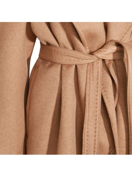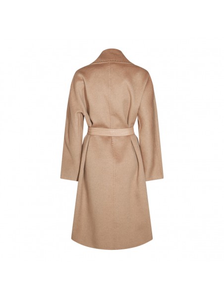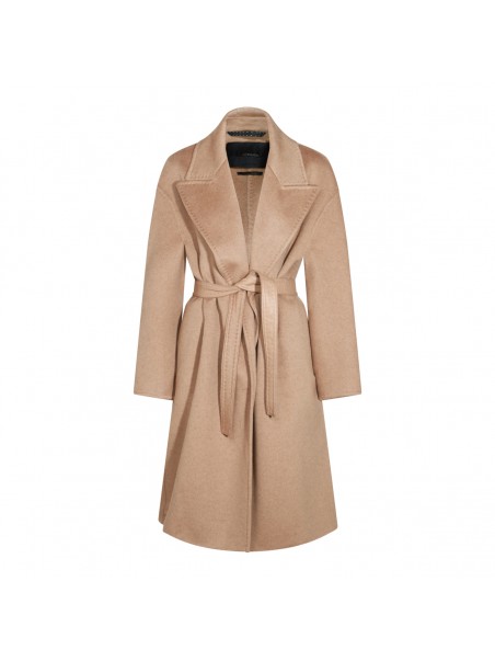 Camel wool coat from Max Mara featuring long sleeves, belt waist, pockets and midi length.
