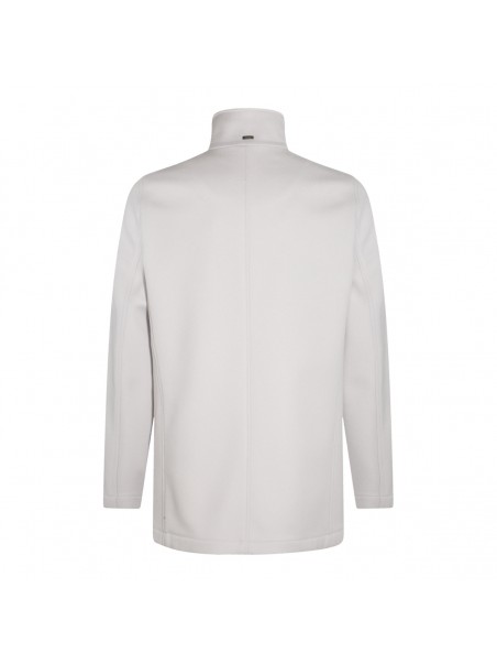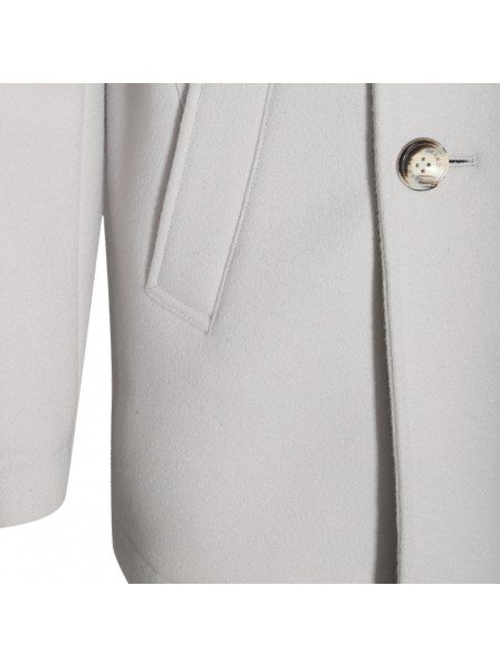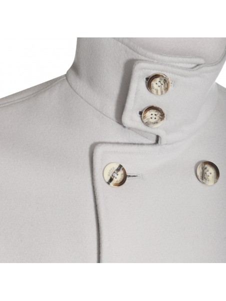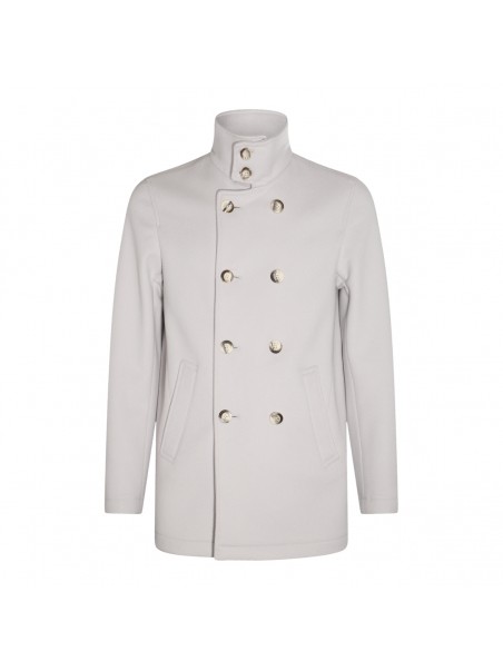 Light grey wool blend coat from Herno featuring high neck, long sleeves, straight hem, double-breasted button fastening and two side welt pockets.