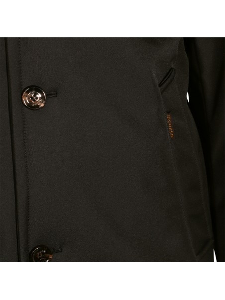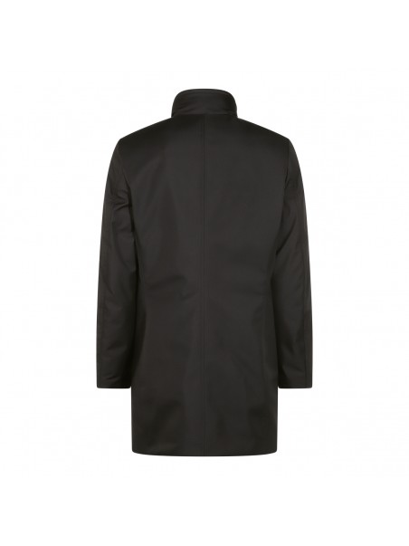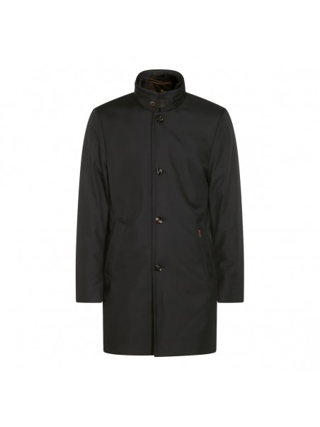 Black Bond coat from Moorer featuring high collar, long sleevees, buttons fastening, pockets and regular vestibility.