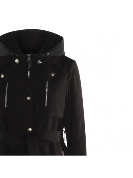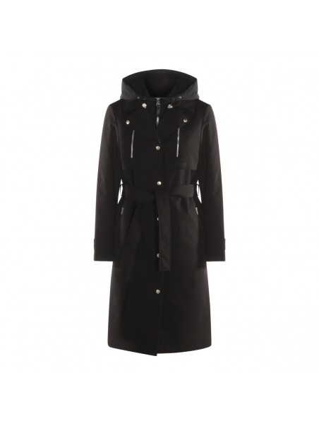 Black coat from Mackage featuring long sleeves, high collar with hood, belt waist, pockets and midi length.