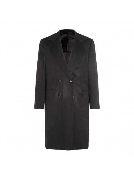 Dark grey cashmere coat from Kiton featuring long sleeves, buttons fastening and midi length.