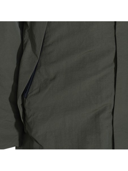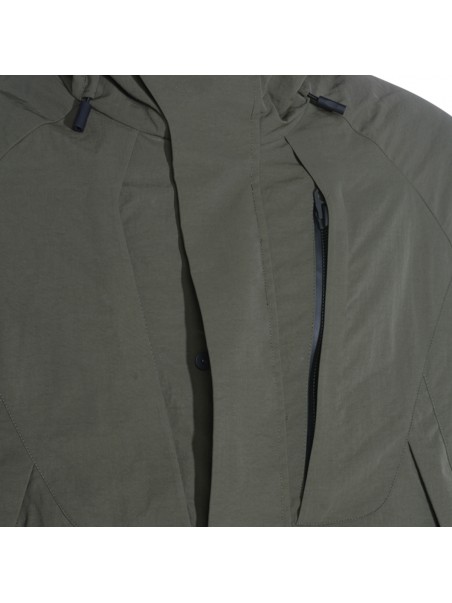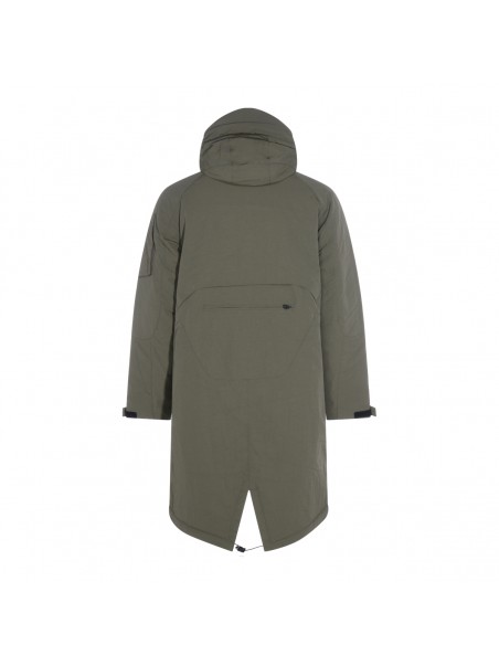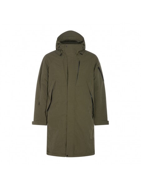 Dark green coat from Jg1 featuring long sleeves, high collar with hood, frontal fastening, pockets and midi length.