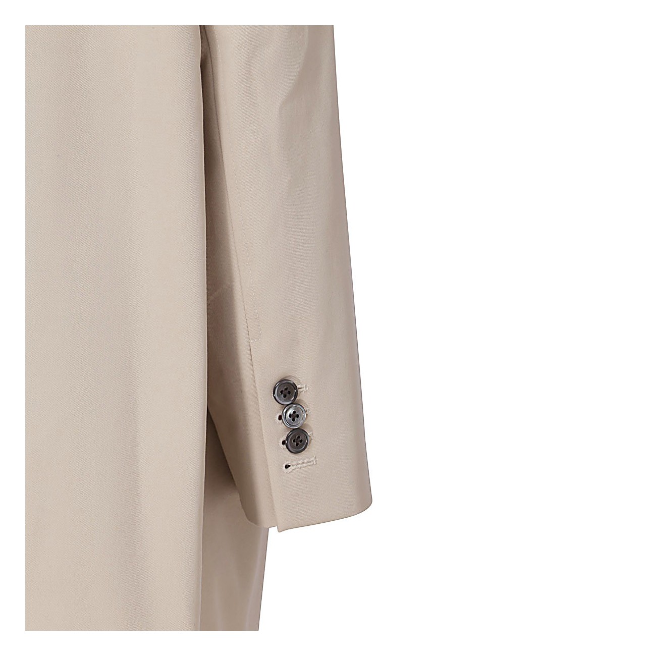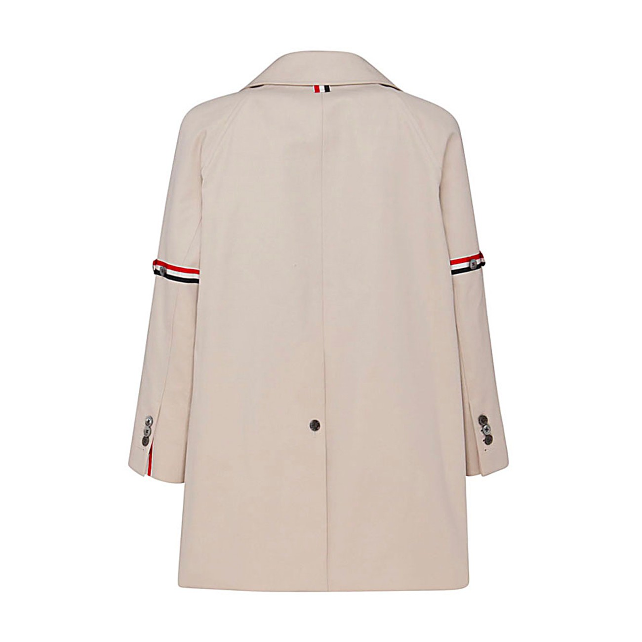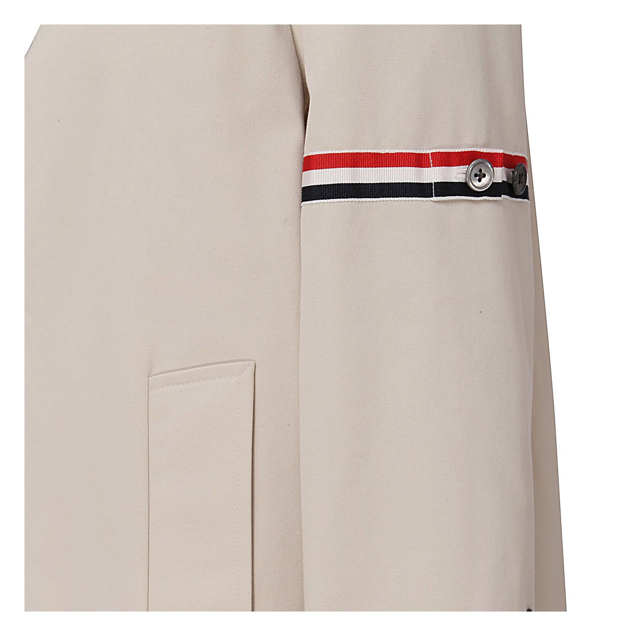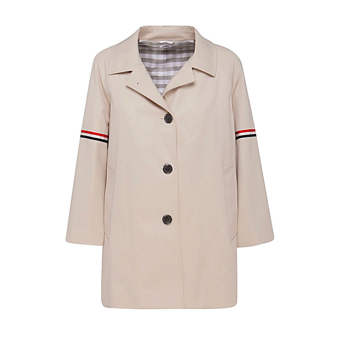 Khaki coat from Thom Browne featuring lapel collar, long sleeves, frontal buttons closure, stripes details, pockets and regular vestibility.