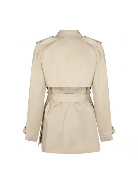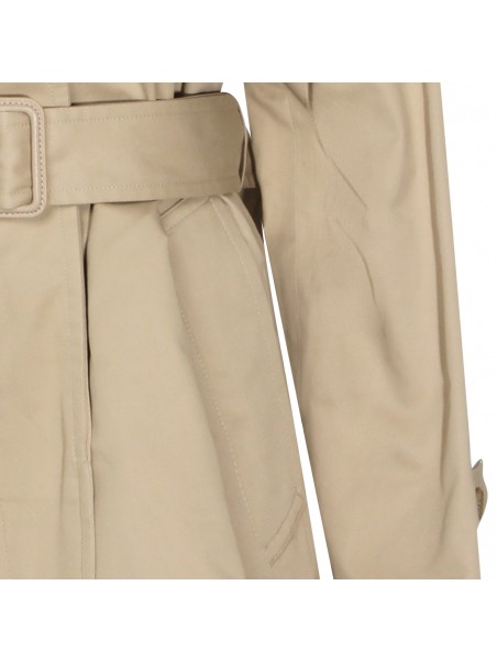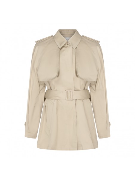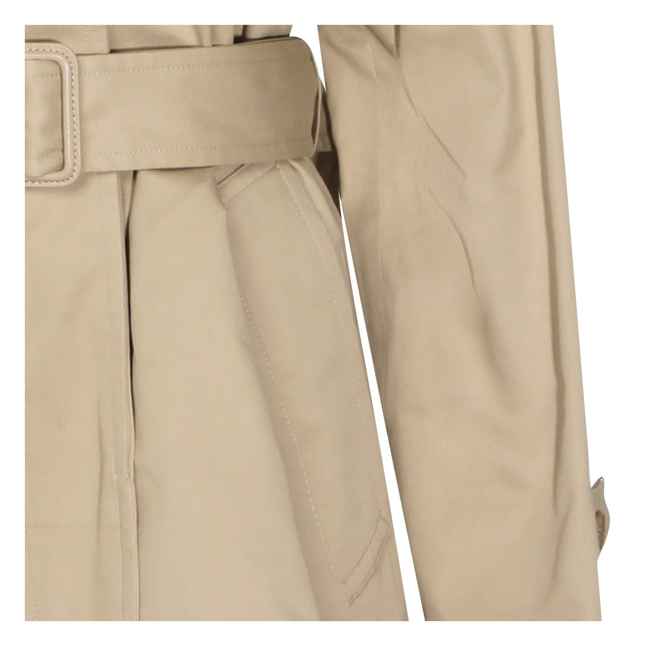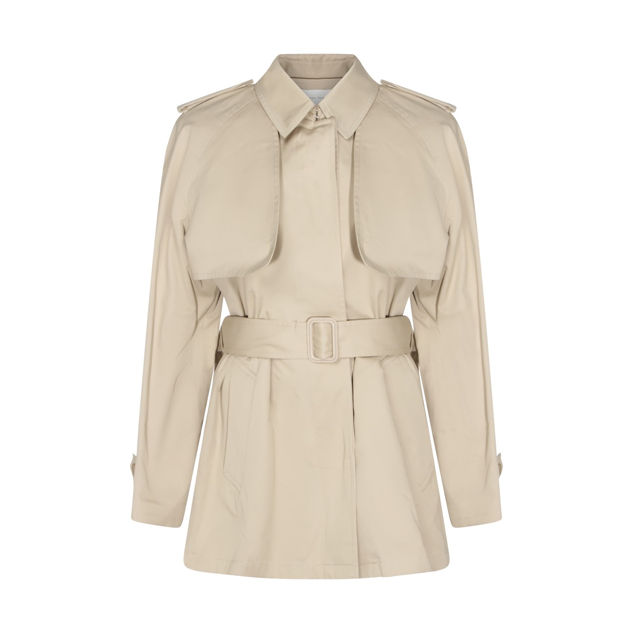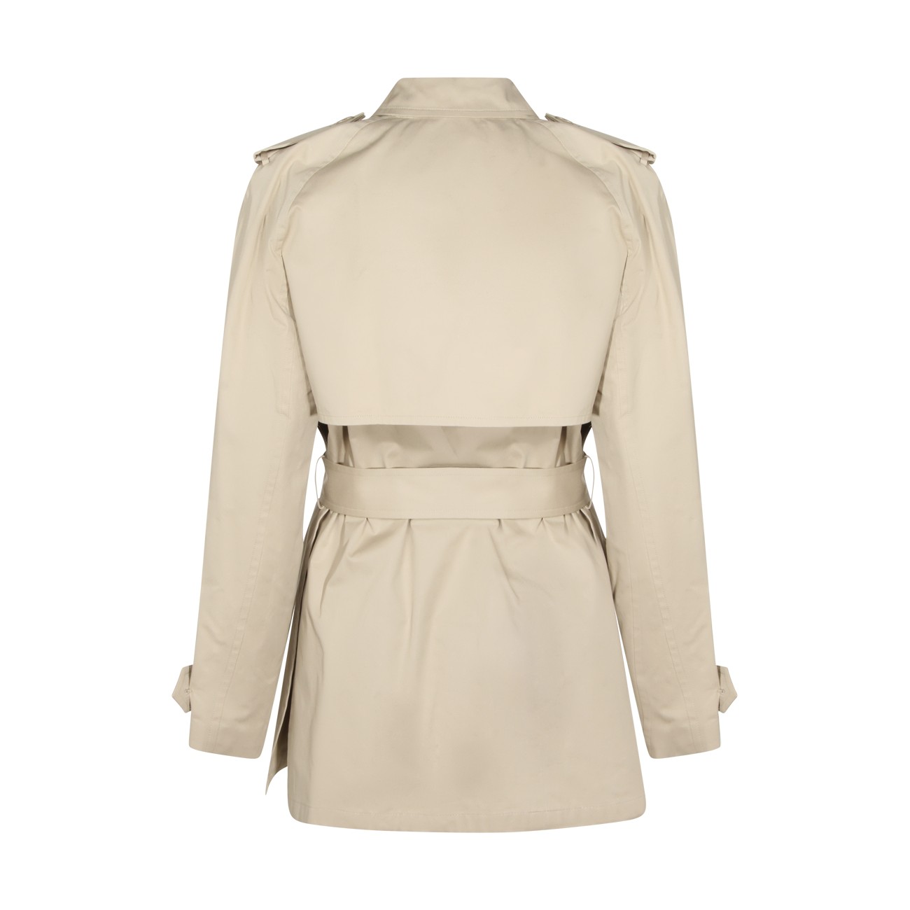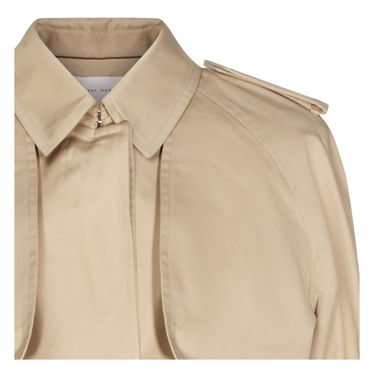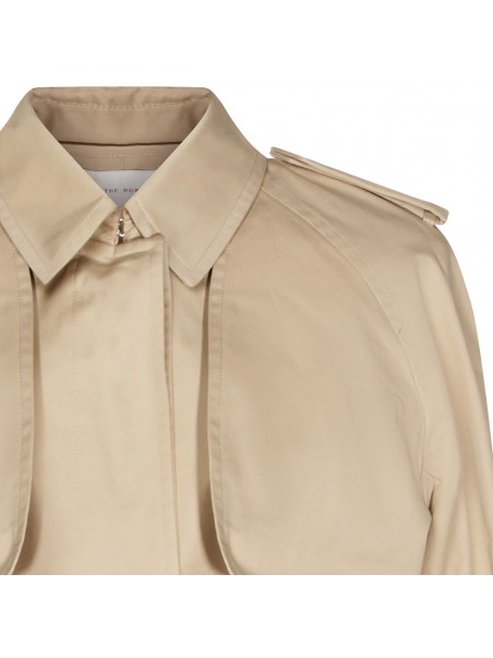 Beige cotton trench coat from The Row featuring classic collar, concealed front button fastening, belted waist, long sleeves, belted cuffs, two side inset pockets, central rear vent and straight hem.