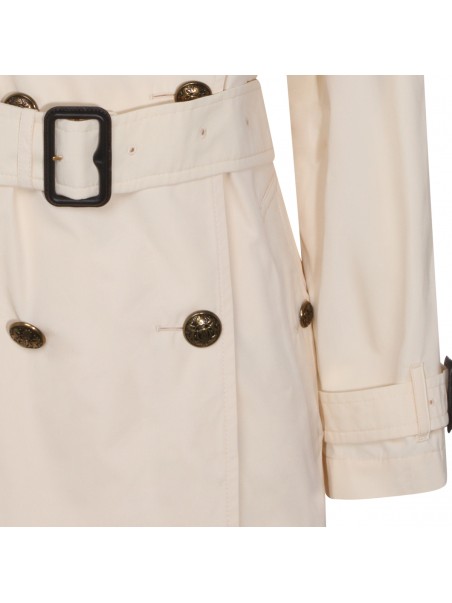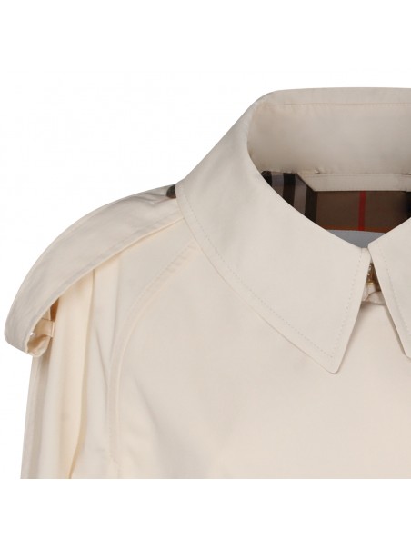 White cotton trench coat from Burberry featuring classic collar, concealed front button fastening, belted waist, long sleeves, belted cuffs, two side inset pockets, central rear vent and straight hem.
