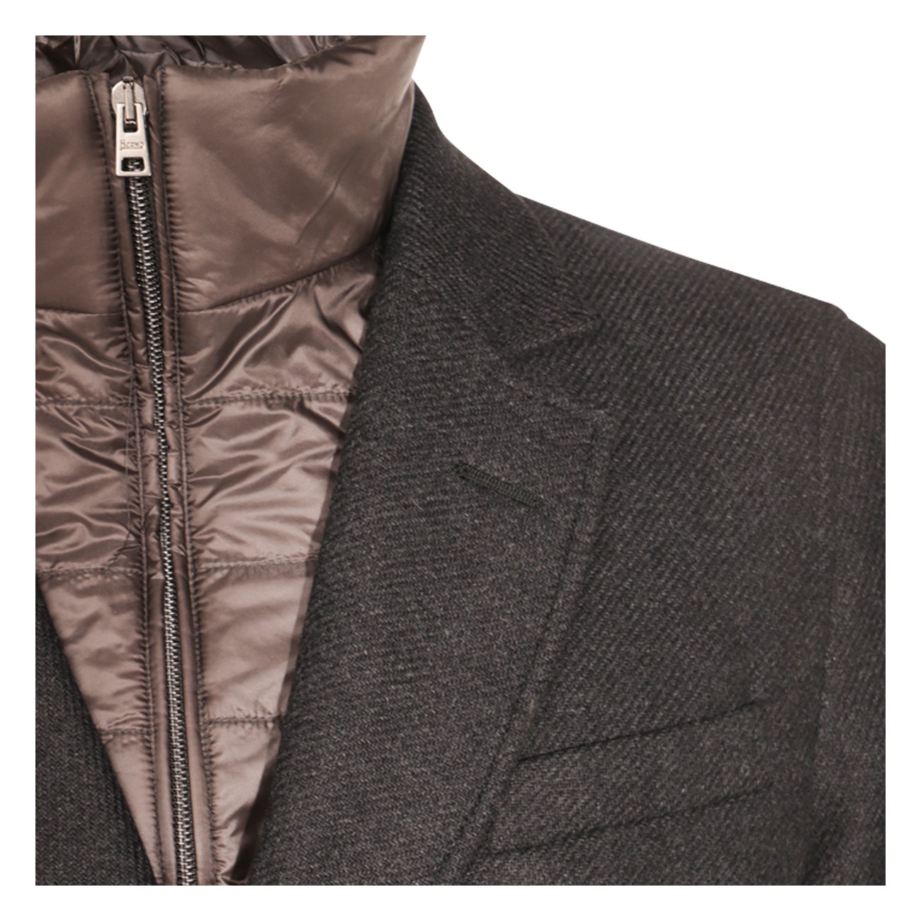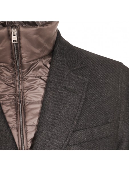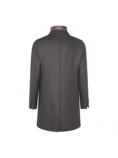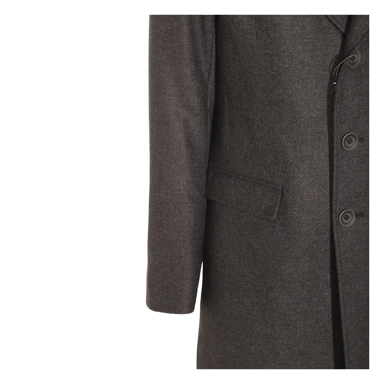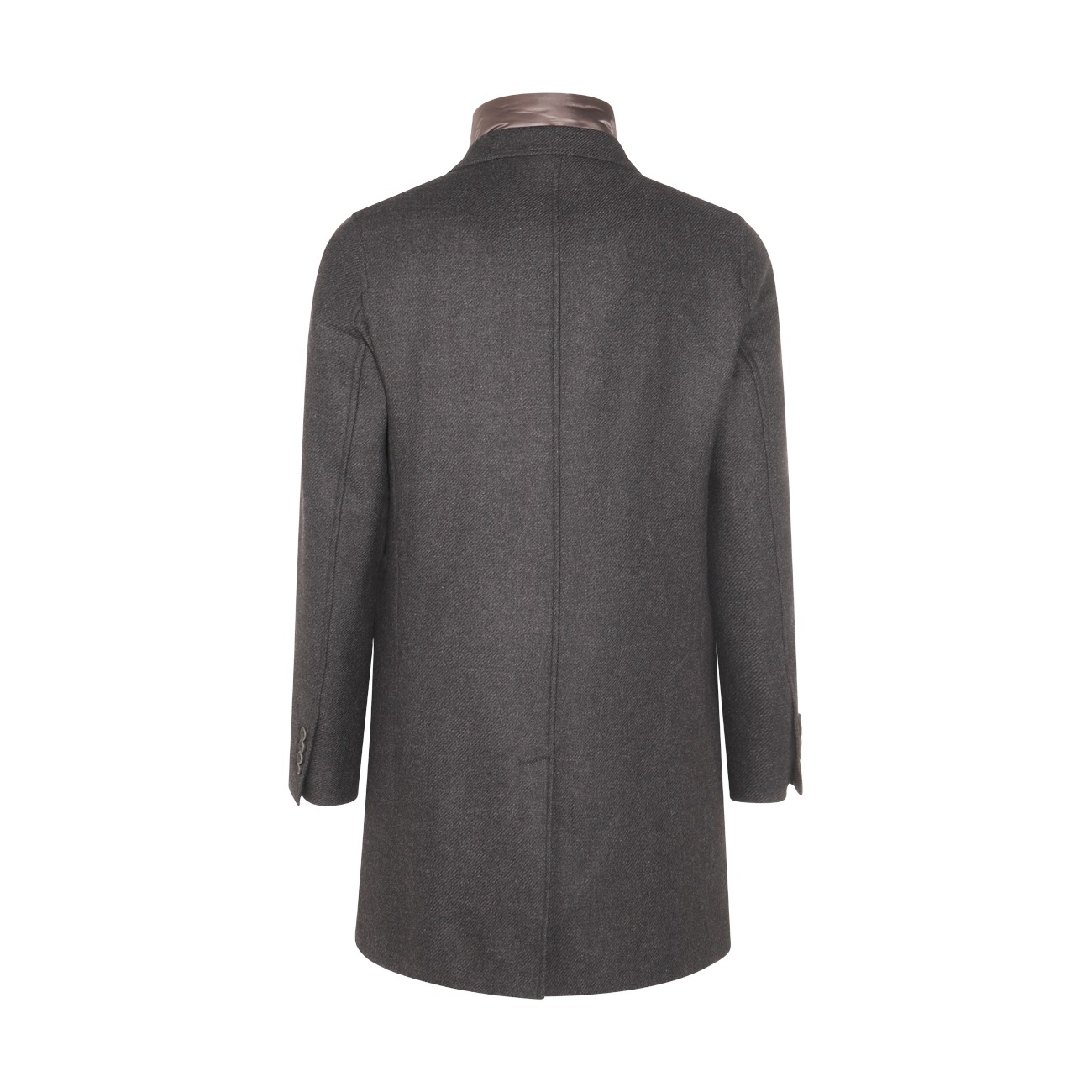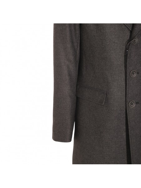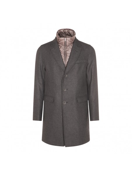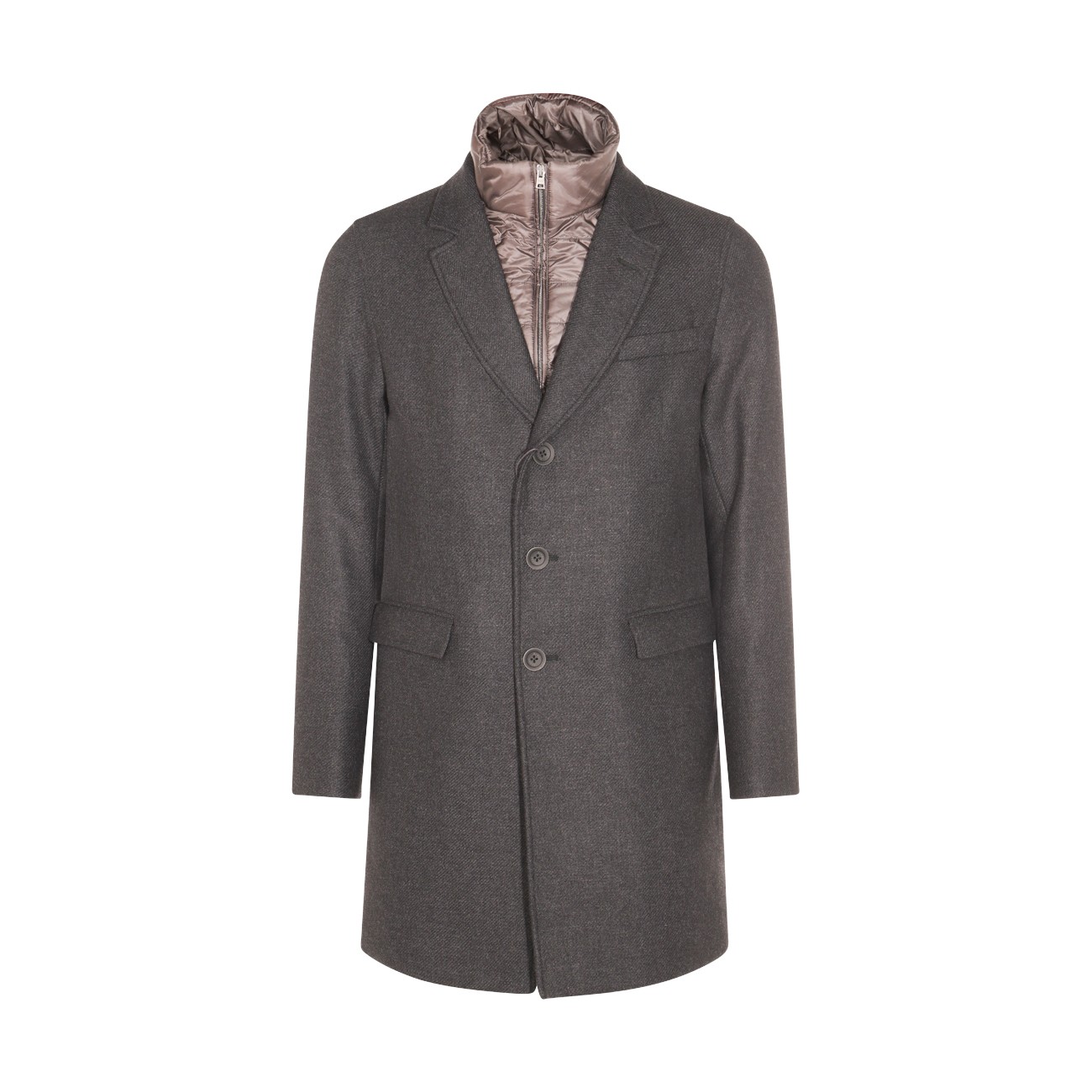 Grey coat from Herno featuring long sleeves, high collar, buttons fastening, pockets and midi length.