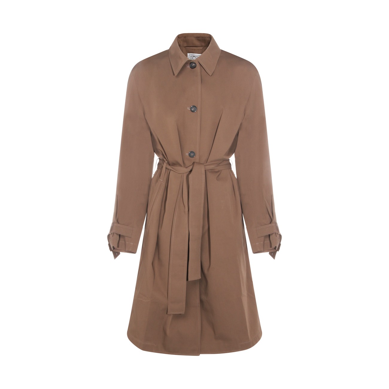 Brown cotton midi trench coat from Toteme featuring shirt collar, frontal buttons fastening, belt waist and mifi length.