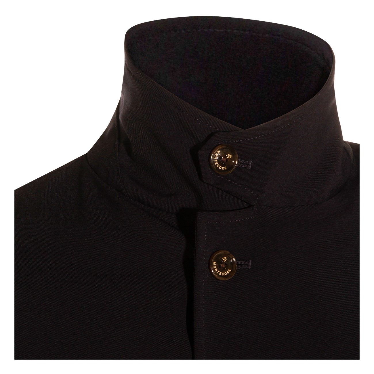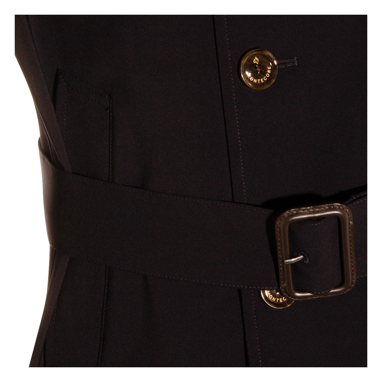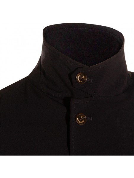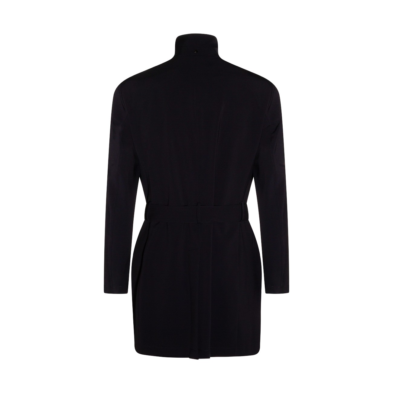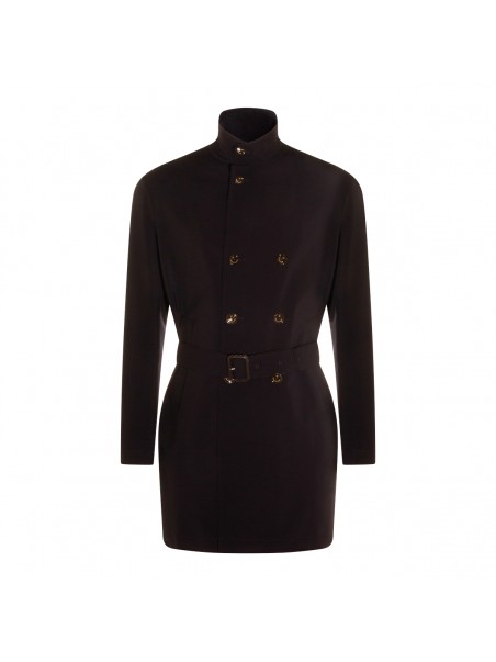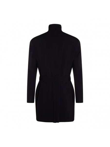Navy blue trench coat from Montecore featuring long sleeves, high collar, double breasted fastening, pockets and mini length.