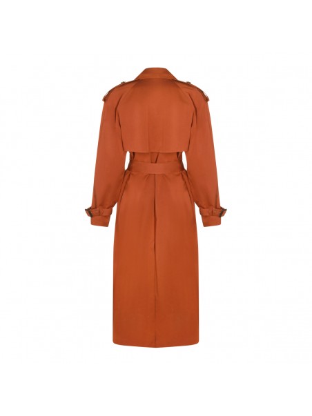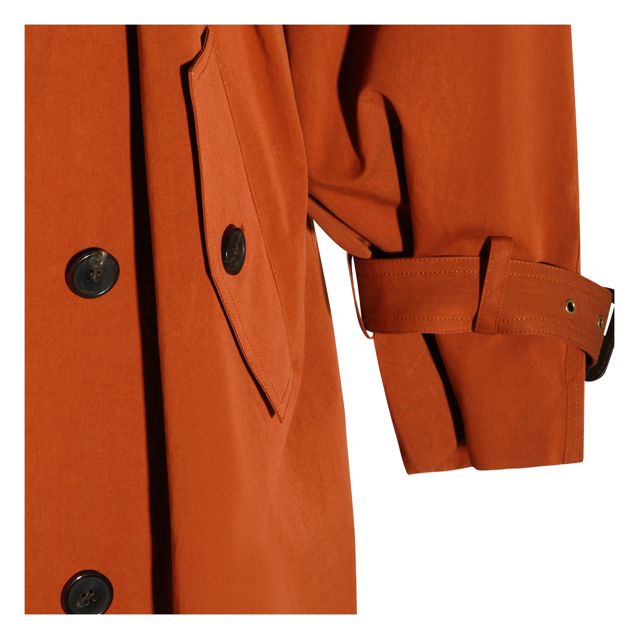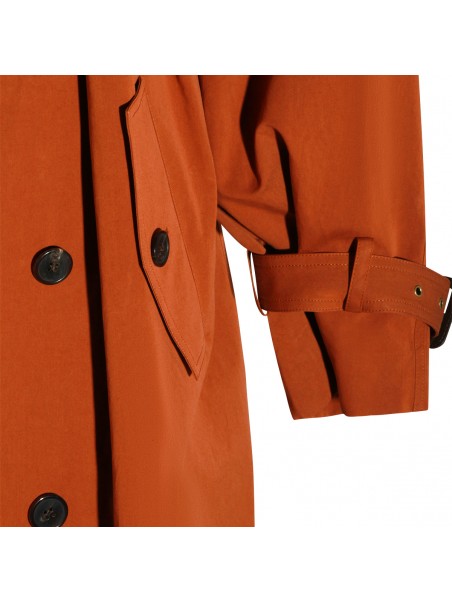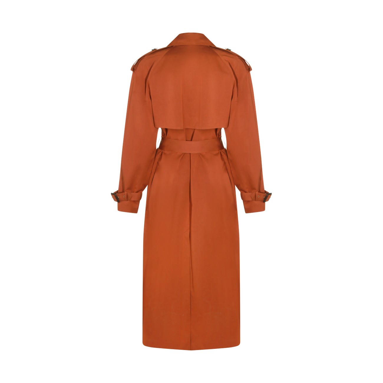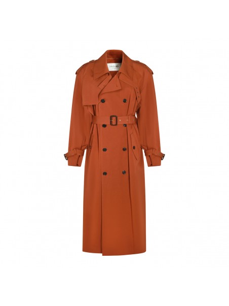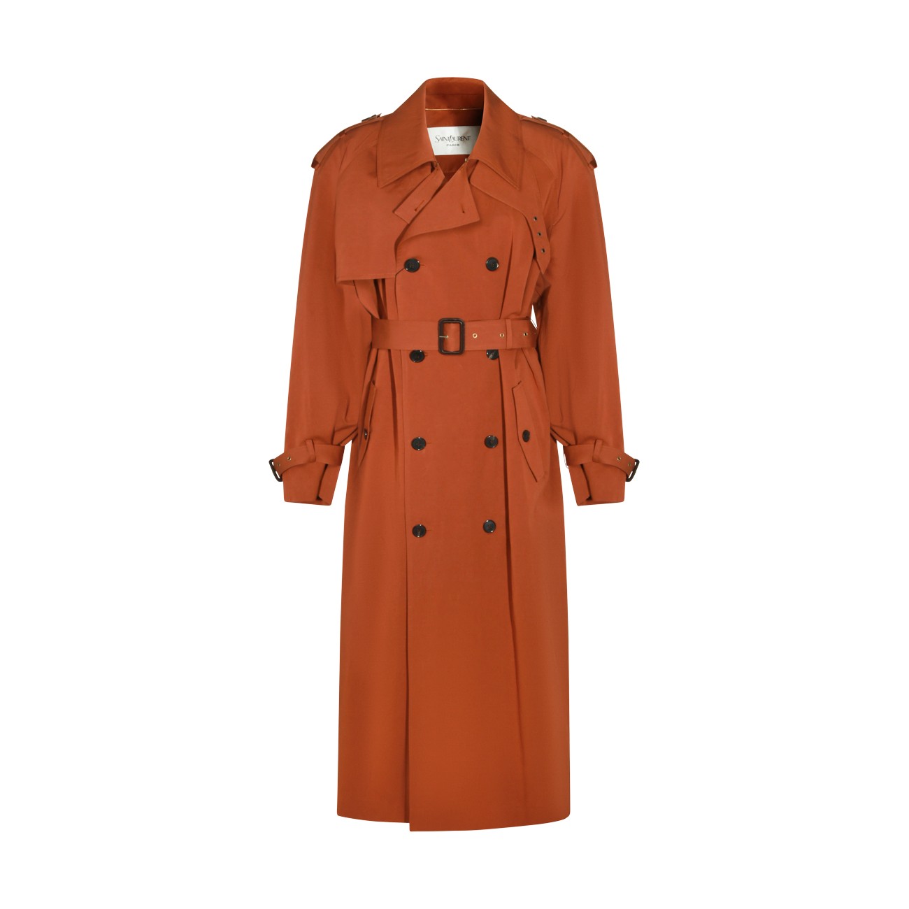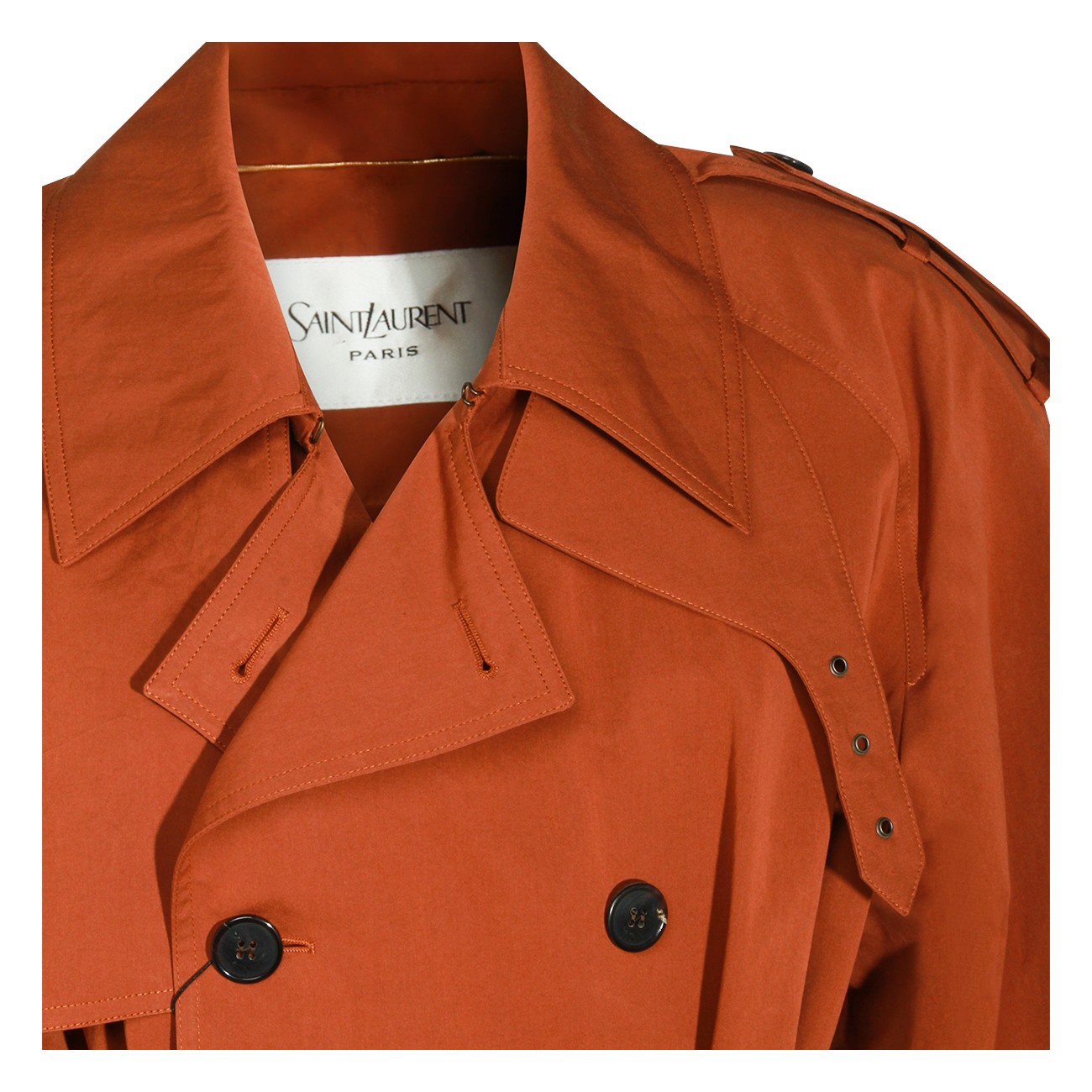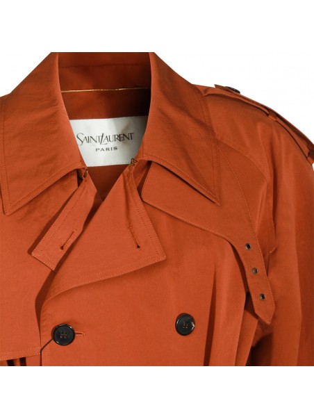 Dark orange cotton trench coat from Saint Laurent featuring long sleeves, double breasted fastening, buttons, belt waist and regualr vestibility.