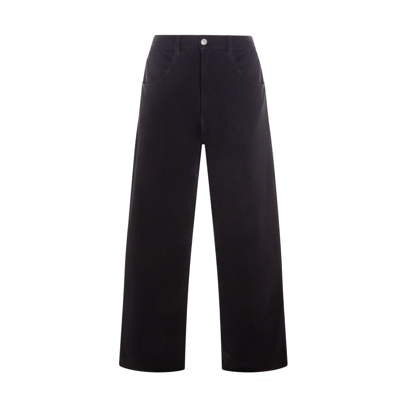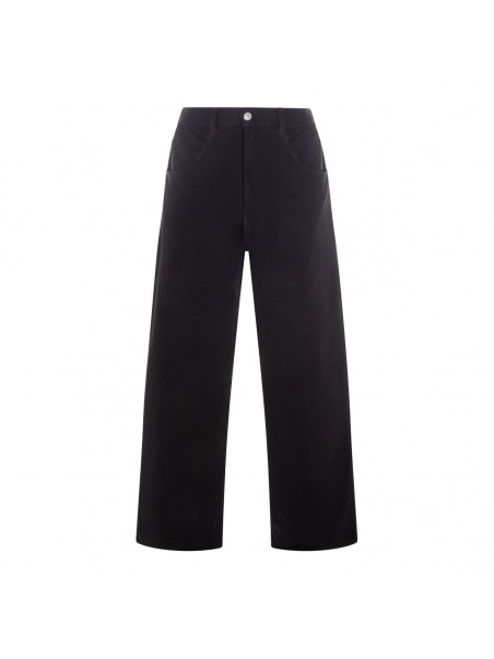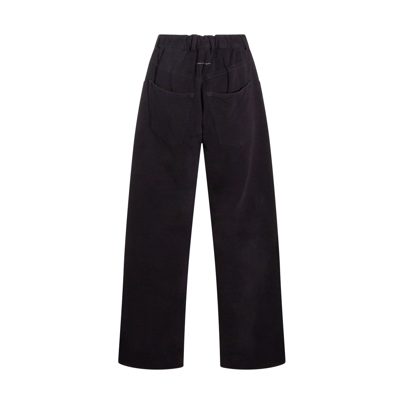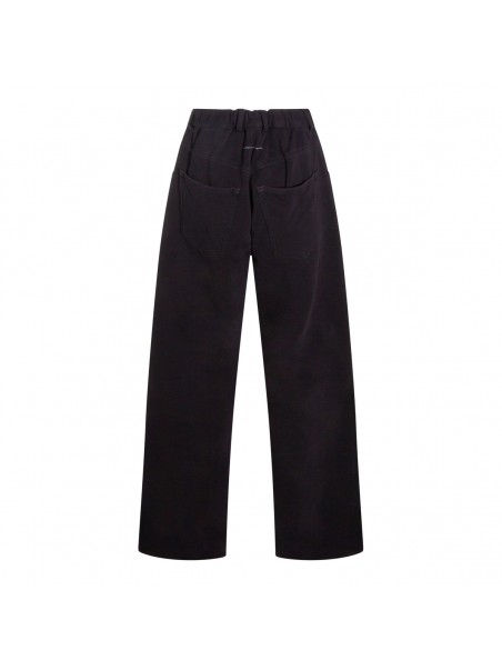 Black cotton jeans from MM6 Maison Margiela featuring high waist, elastic waistband, belt loops, button and zip fastening, five-pockets, back logo stitching, wide leg and oversize fit.