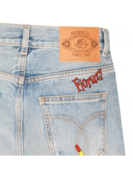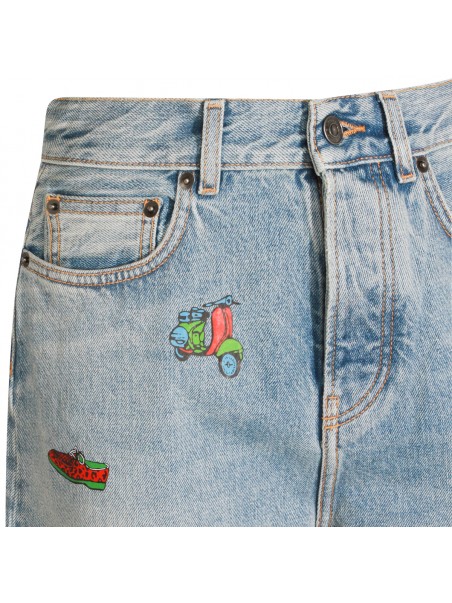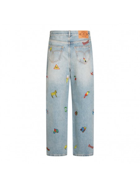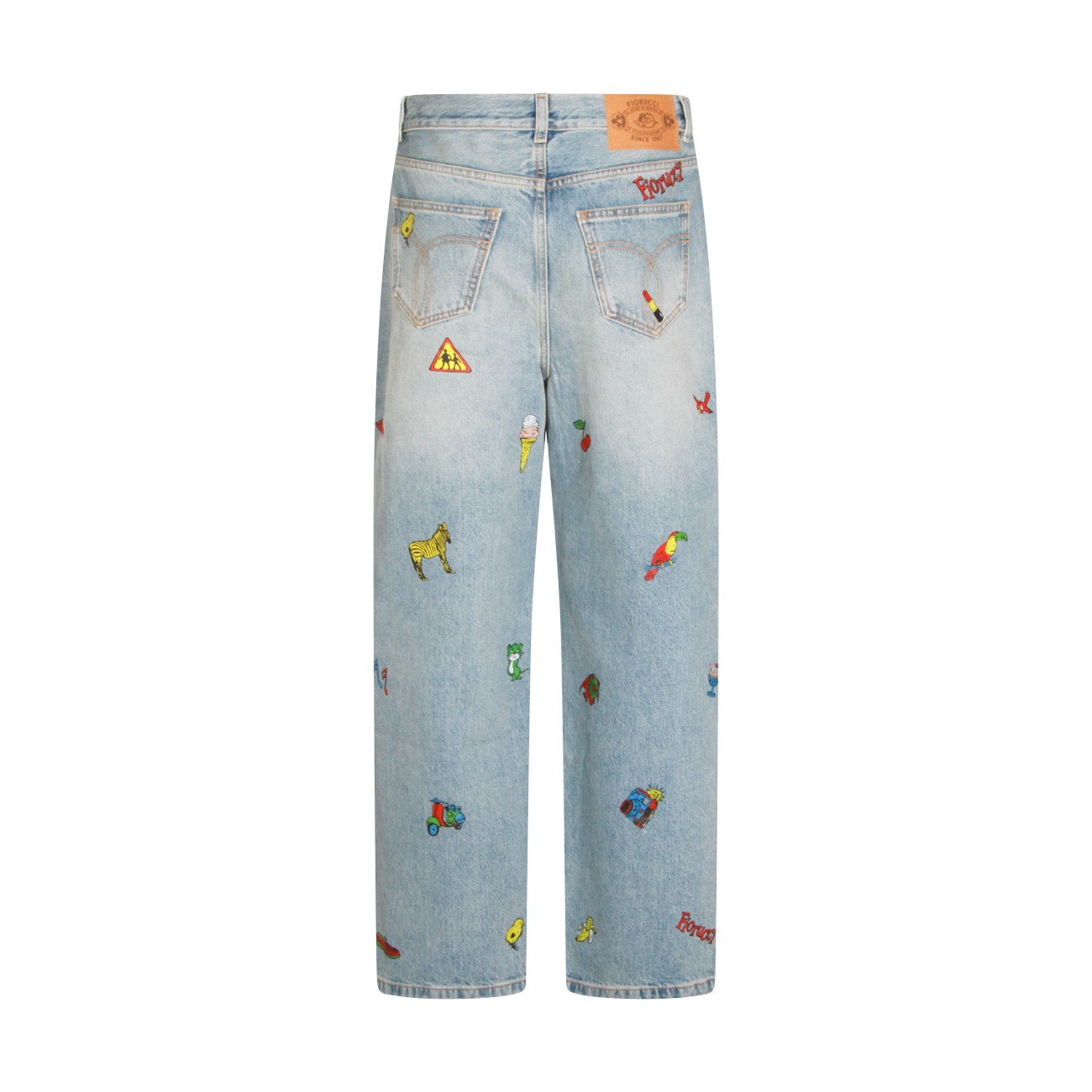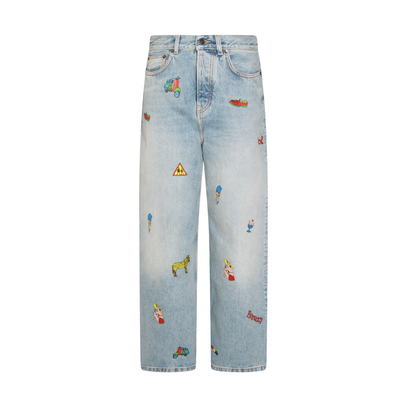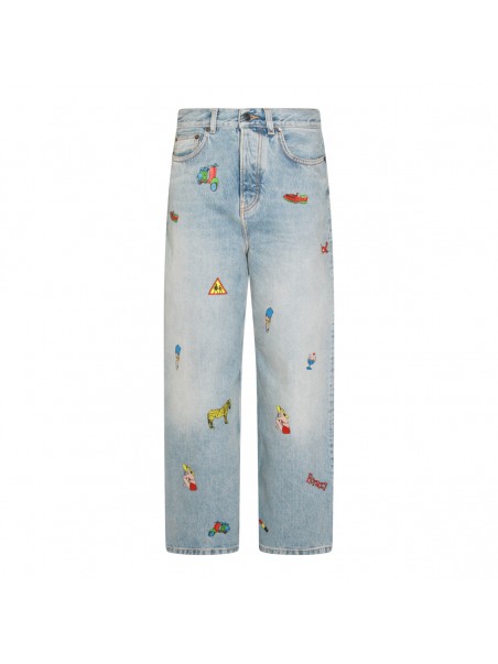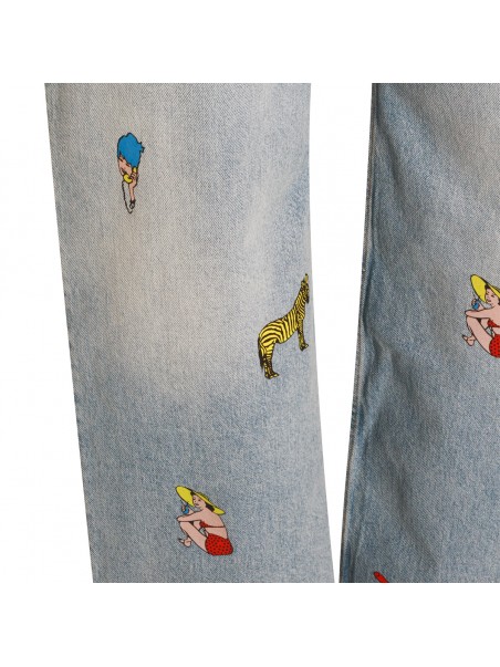 Light blue cotton jeans from Fiorucci featuring high waist, belt loops, zip and button fastening, classic 5 pockets, all-over prints and wide leg.