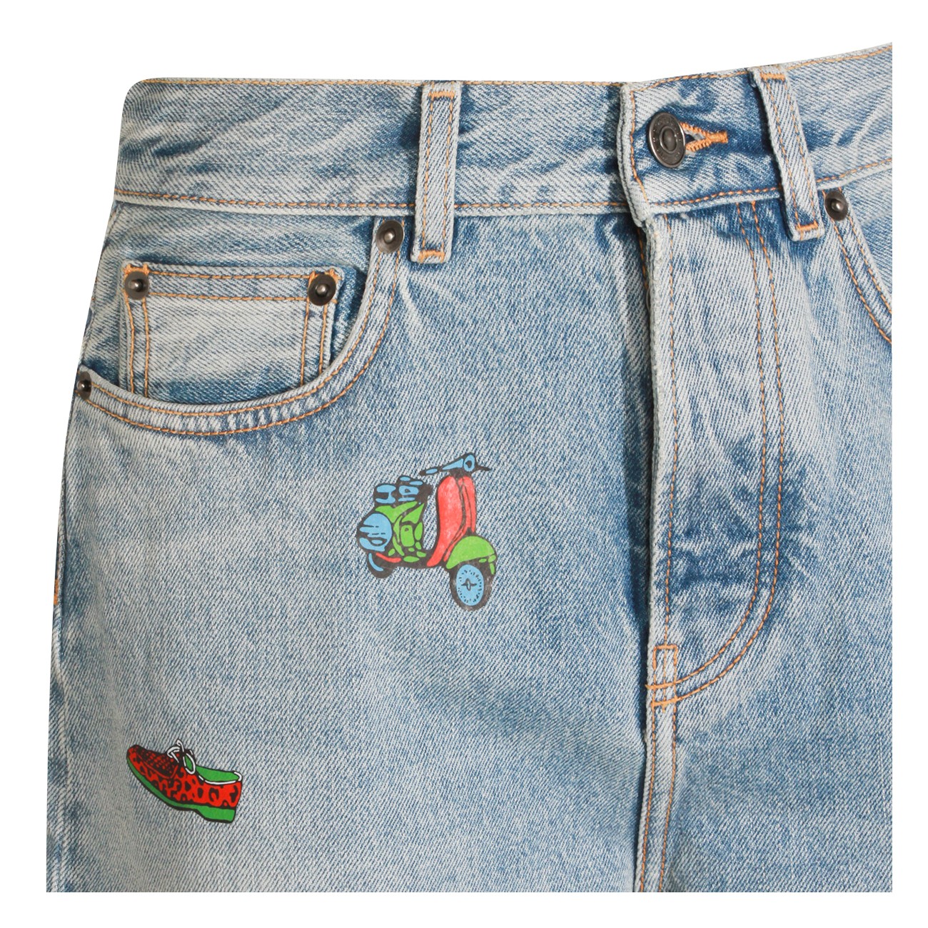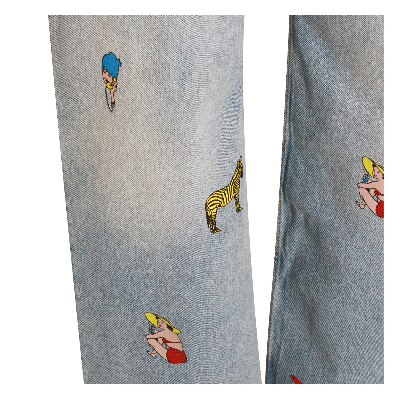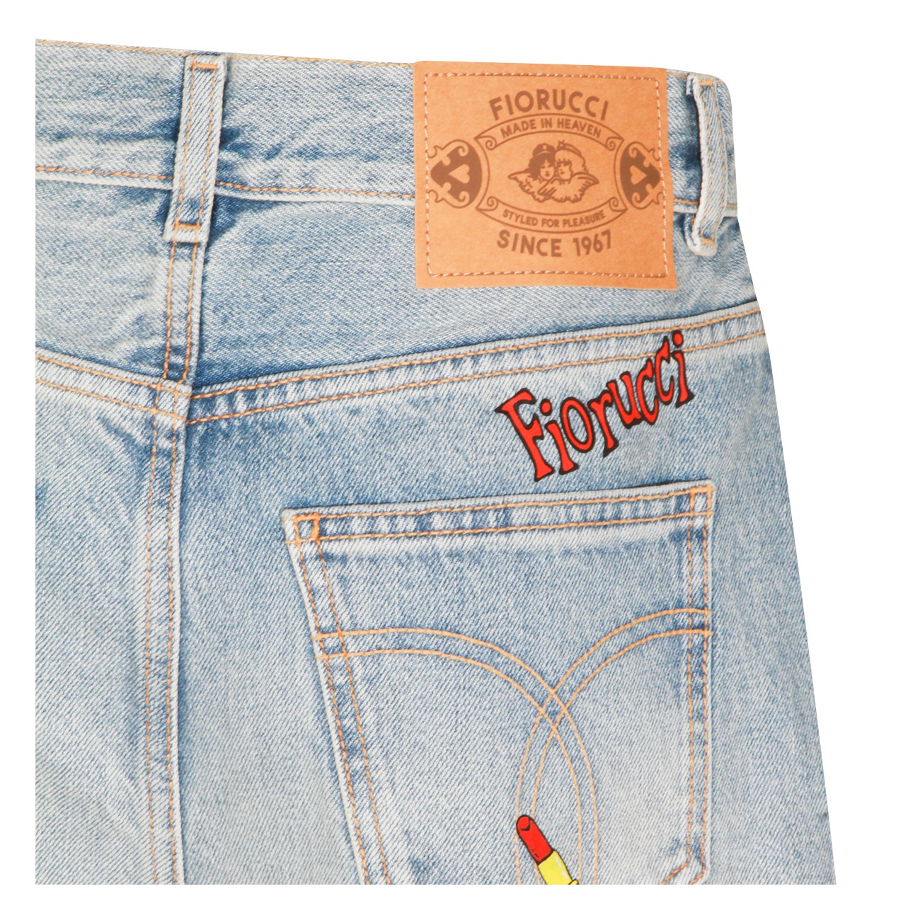 Light blue cotton jeans from Fiorucci featuring high waist, belt loops, zip and button fastening, classic 5 pockets, all-over prints and wide leg.