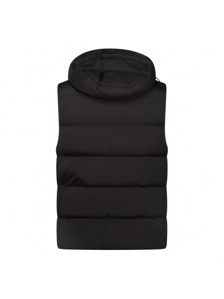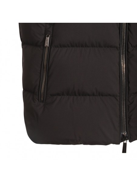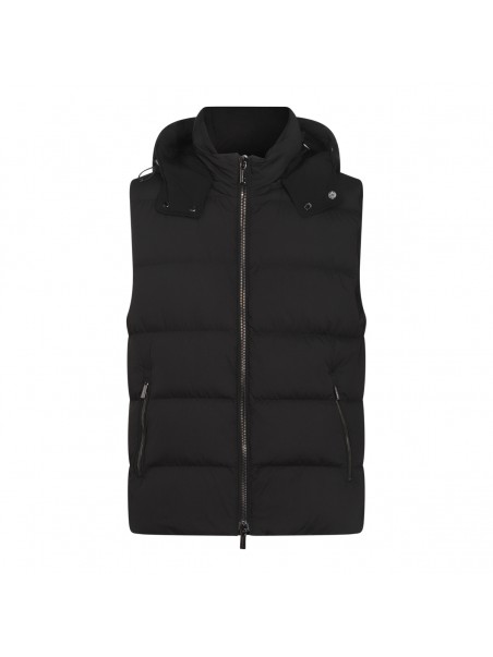 Black Fire down jacket from Moorer featuring sleeveless, high collar, hood, zip fastening and pockets.