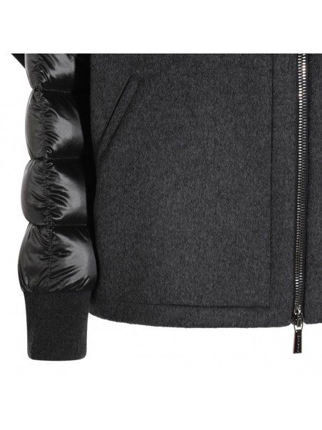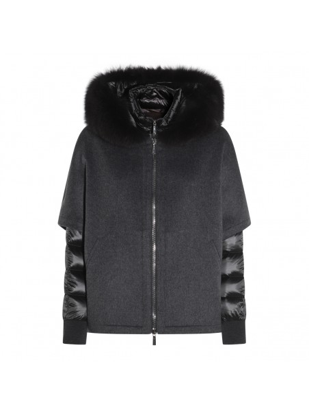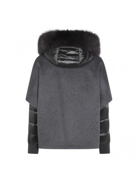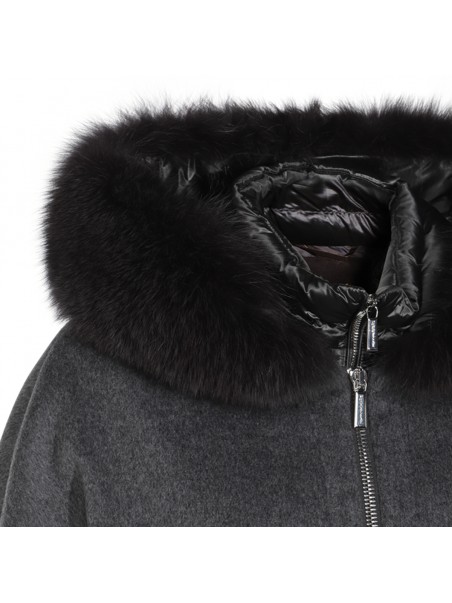 Dark grey wool down jacket from Moorer featuring long sleeves, hood, zip fastening, fur and regular vestibility.