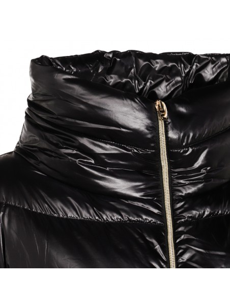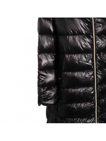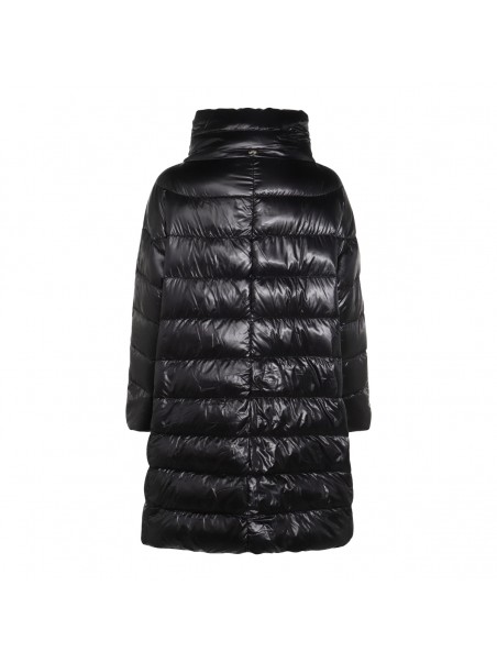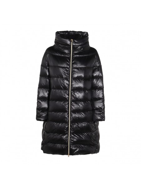 Black down jacket from Herno featuring long sleeves, high collar, zip fastening, midi length and pockets.