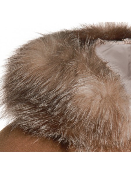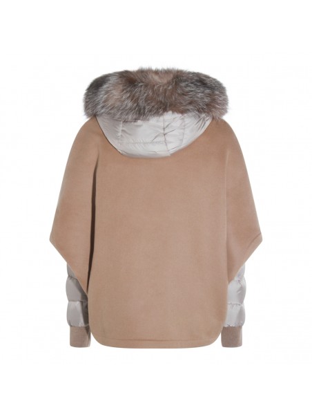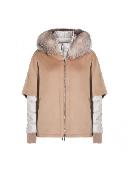 Beige wool down jacket from Moorer featuring long sleeves, hood, zip fastening, fur and regular vestibility.
