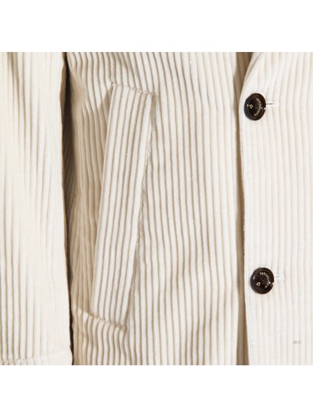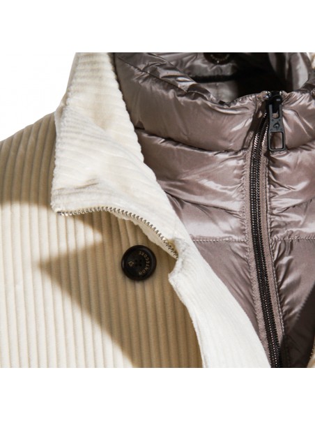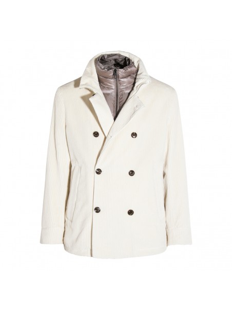 Ivory coat from Montecore featuring high collar, double breasted fastening, pockets and regular vestibility.