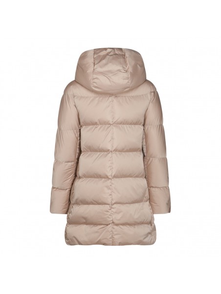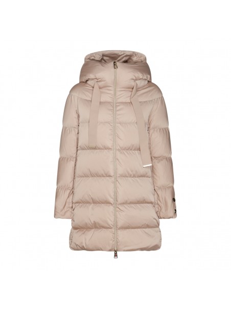 Beige puffer down jacket from Herno featuring mid length, zip closure, hoodie with grosgrain drawstring, side pockets and gold tone metal hardware.