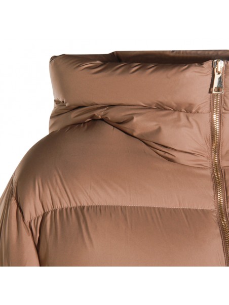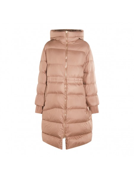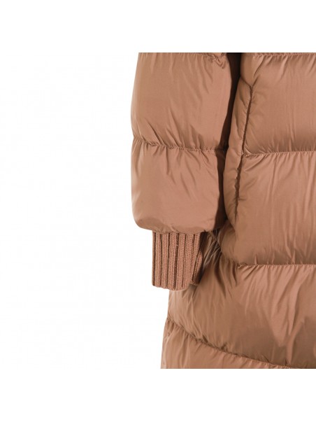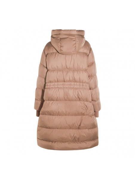 Beige down jacket from Fabiana Filippi featuring high collar, long sleeves, hood, quilted, zip fastening, ribbed cuffs and long lenght.