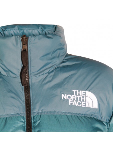 Blue down jacket from The North Face featuring high collar, long sleeves, padded, logo and regular vestibility.