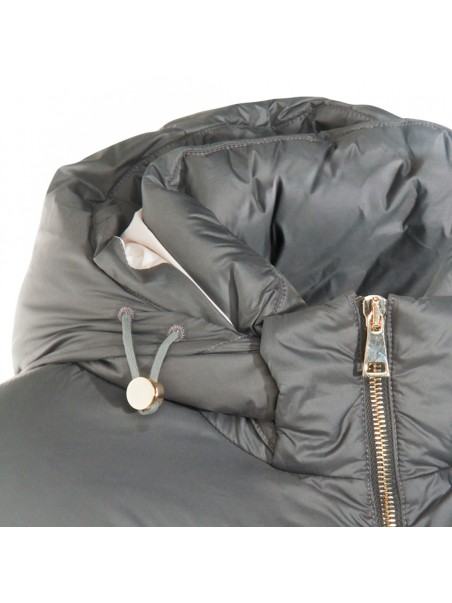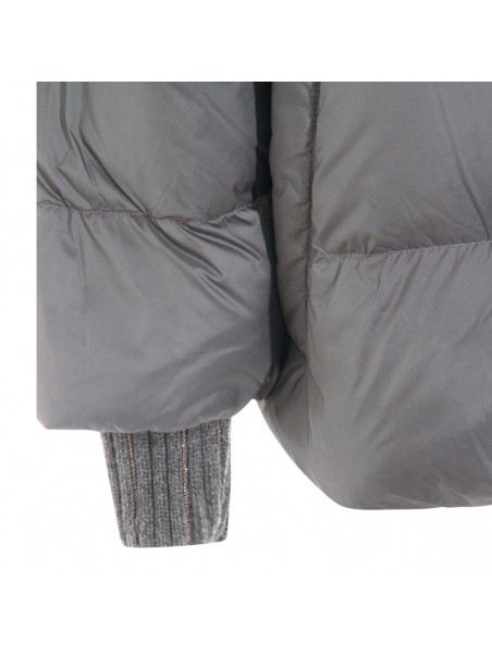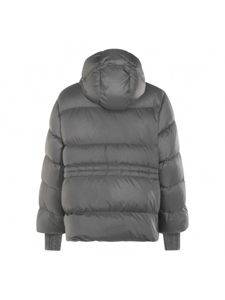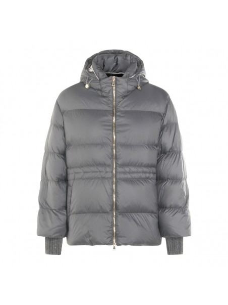 Grey down jacket from Fabiana Filippi featuring hood, high collar, ribbed cuffs and zip fastening.