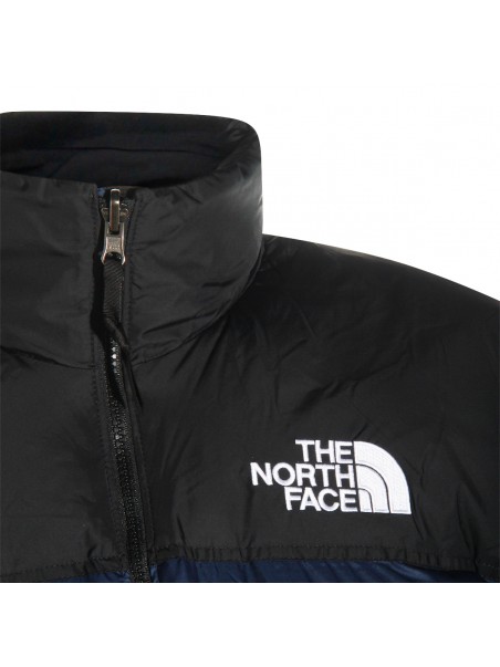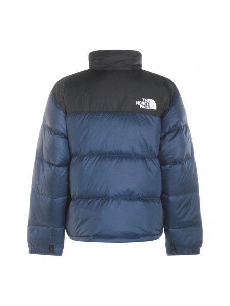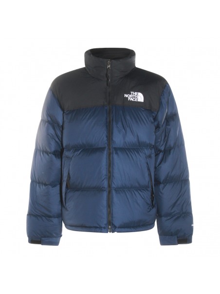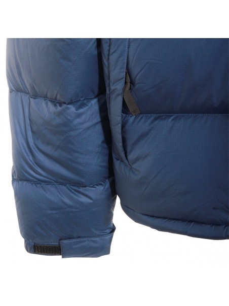 Blue down jacket from The North Face featuring long sleeves, high collar, frontal print and regular vestibility.