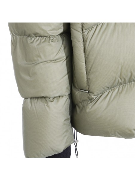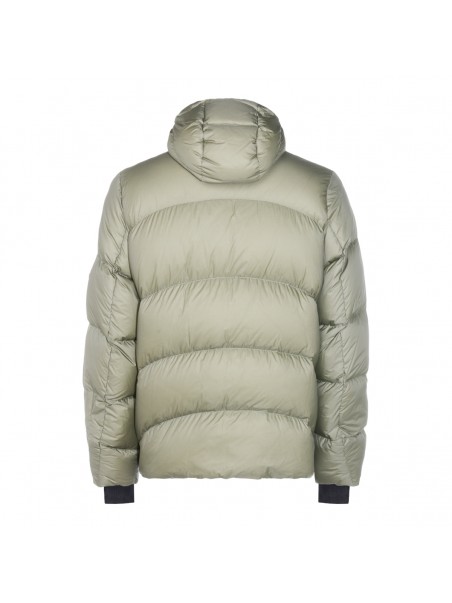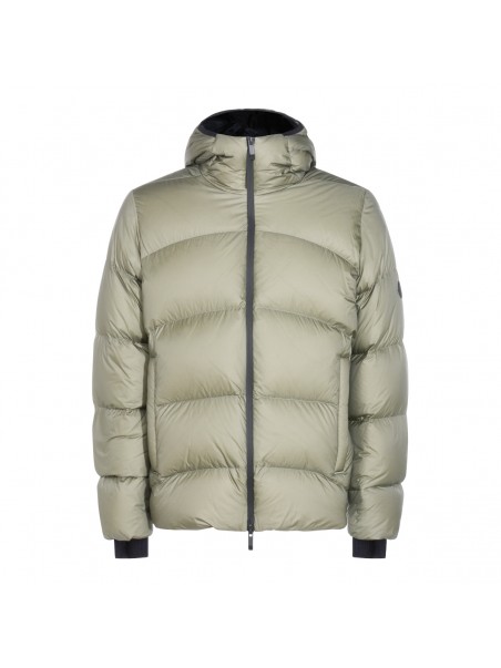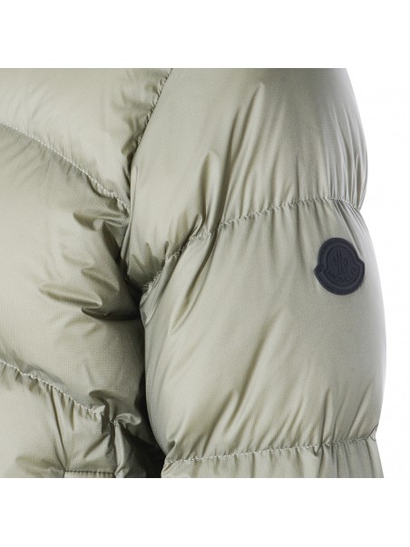 Light green down jacket from Moncler featuring high collar, hood, long sleeves, padded, quilted, zip fastening, zipped pockets, elasticated ribbed cuffs and regular vestibility.