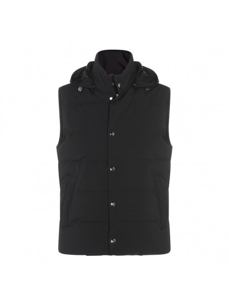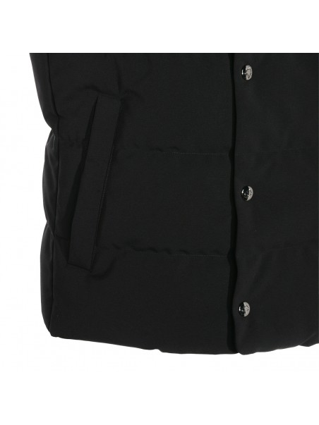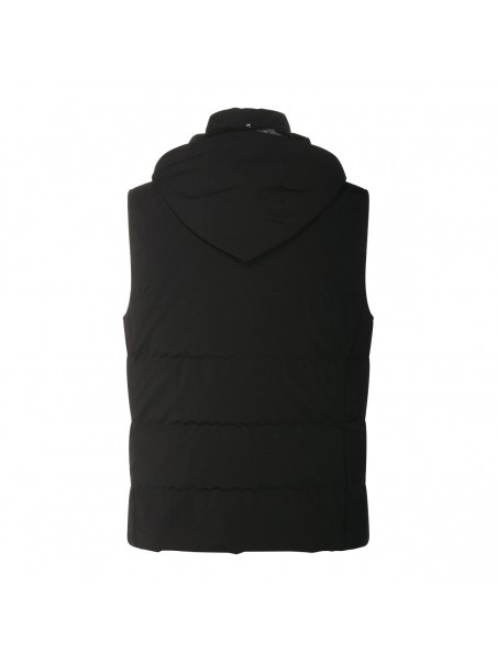 Black down jacket from Montecore featuring high collar, hood, sleeveless, frontal fastening, padded, pockets and regular vestibility.