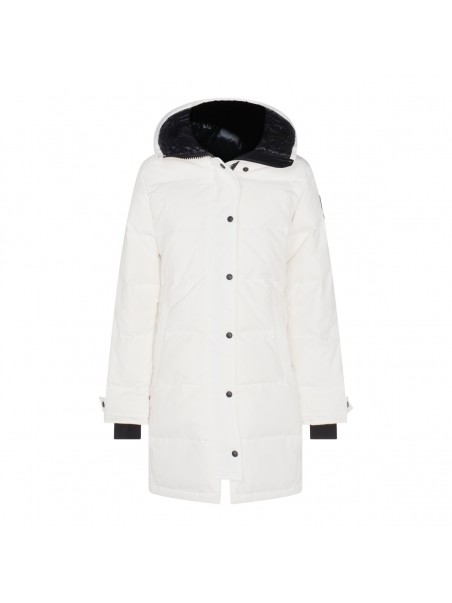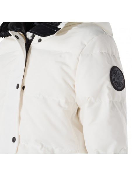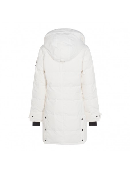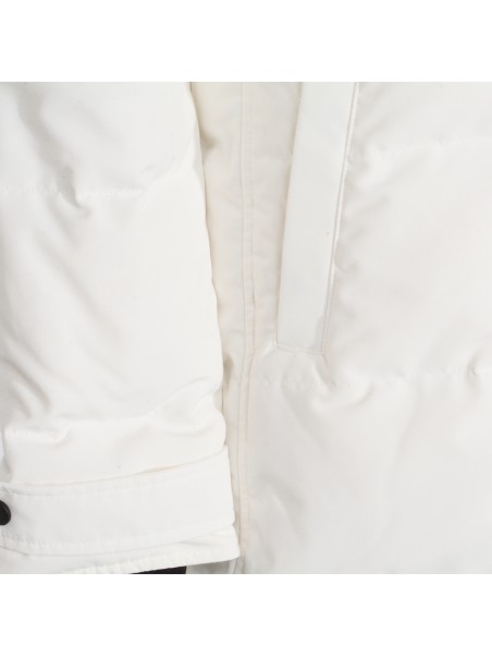 White parka down jacket from Canada Goose featuring long sleeves, frontal fastening, pockets and midi length.