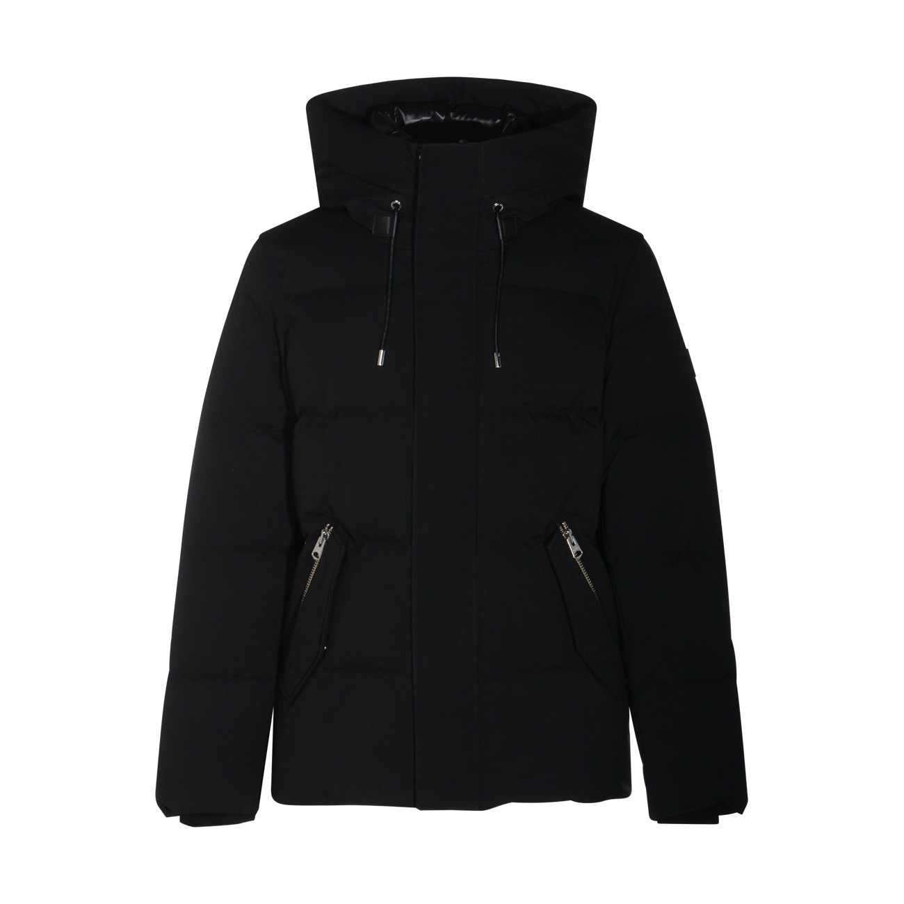 Black down jacket from Mackage featuring high collar, hood, long sleeves, padded, quilted, drawstrings, frontal fastening, pockets and regular vestibility.