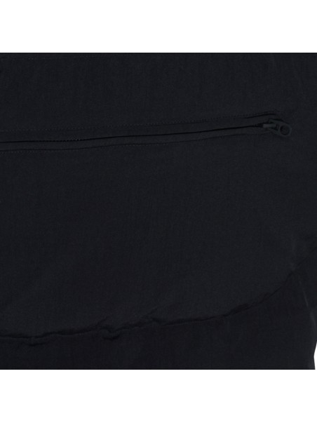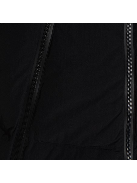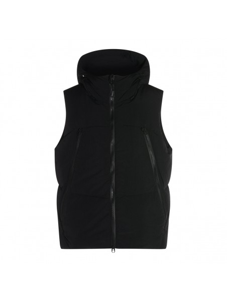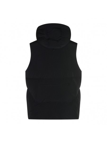 Black down jacket from Jg1 featuring high collar with hood, zip fastening, pockets and sleeveless.